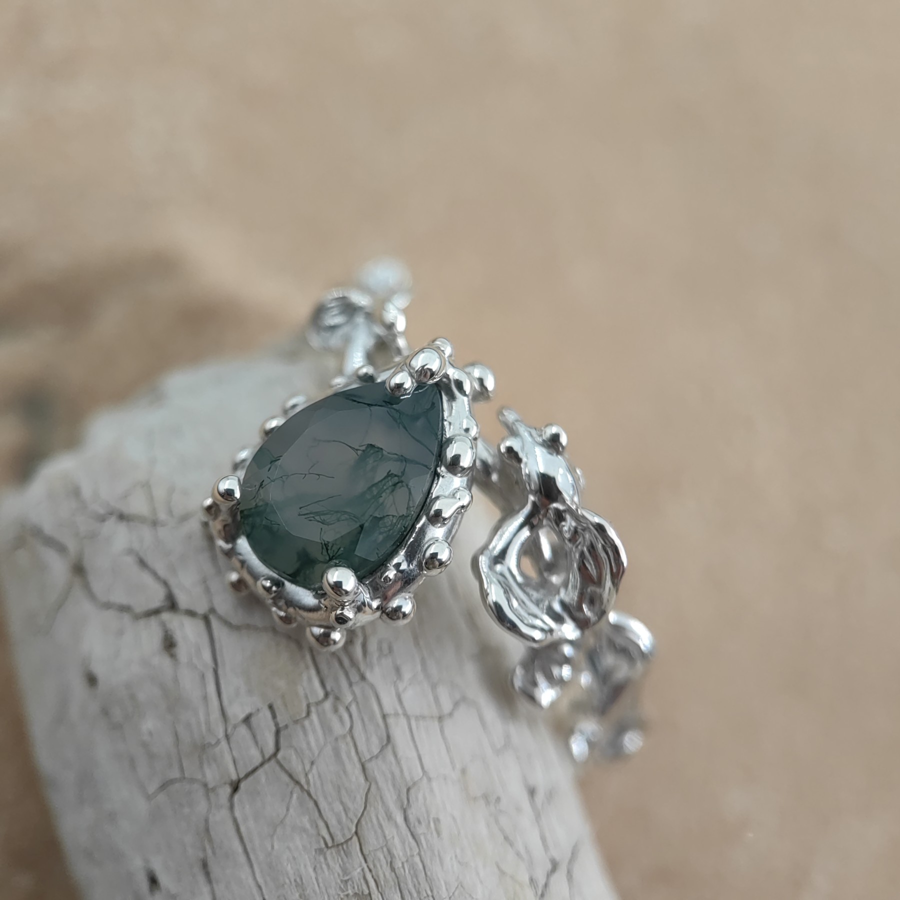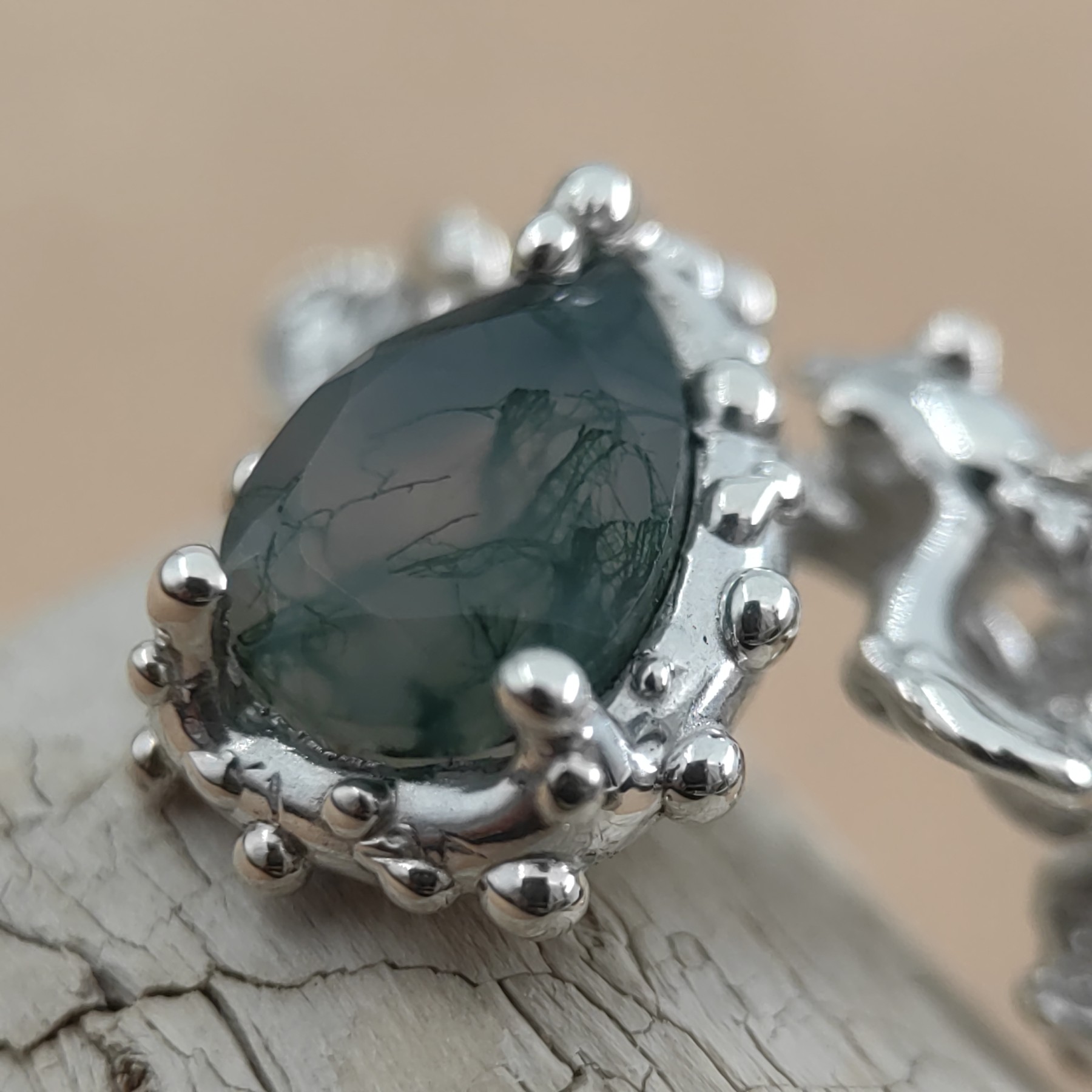 The central stone is a pear-shaped moss agate, characterized by its semi-translucent body and natural dendritic inclusions that create an organic, landscape-like pattern within the stone.