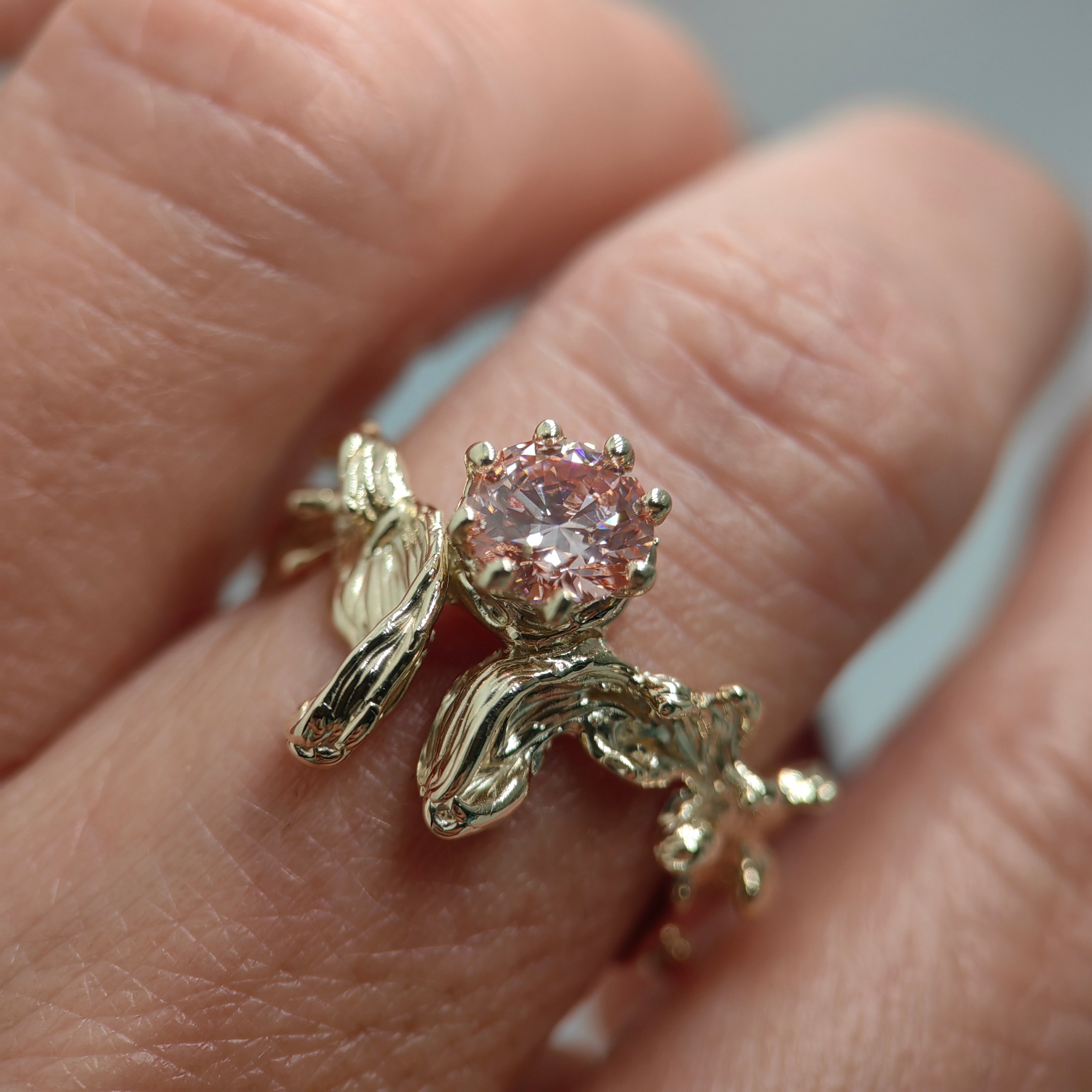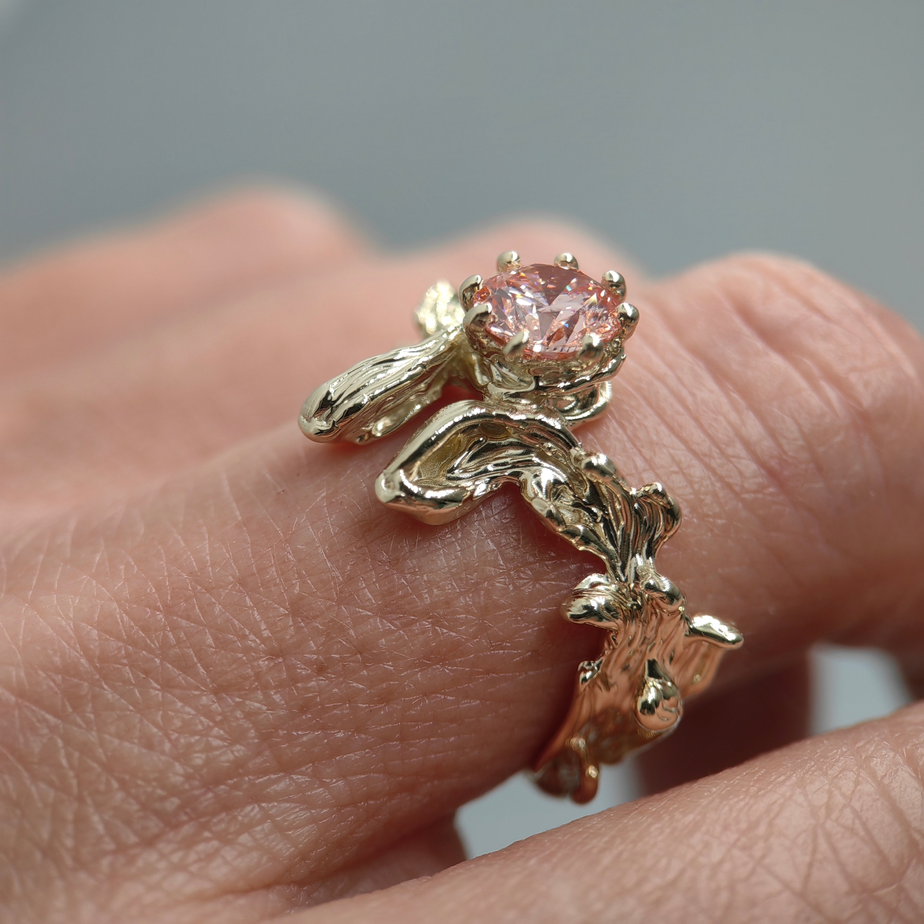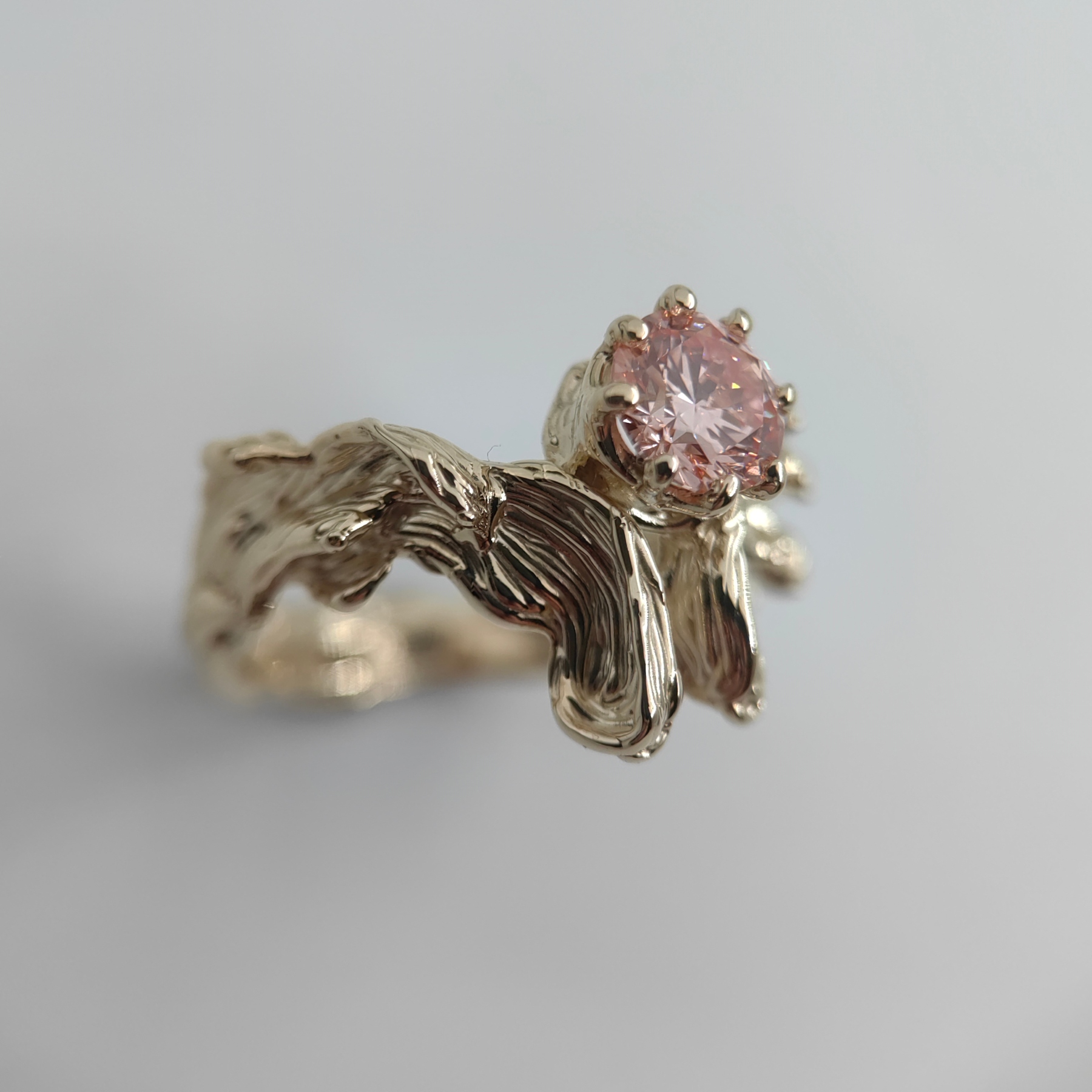 Soft, organically shaped 9K yellow gold embraces a round 1.01 ct pink lab grown diamond, radiant and refined. Its gentle hue reflects warmth, intimacy, and understated luxury.