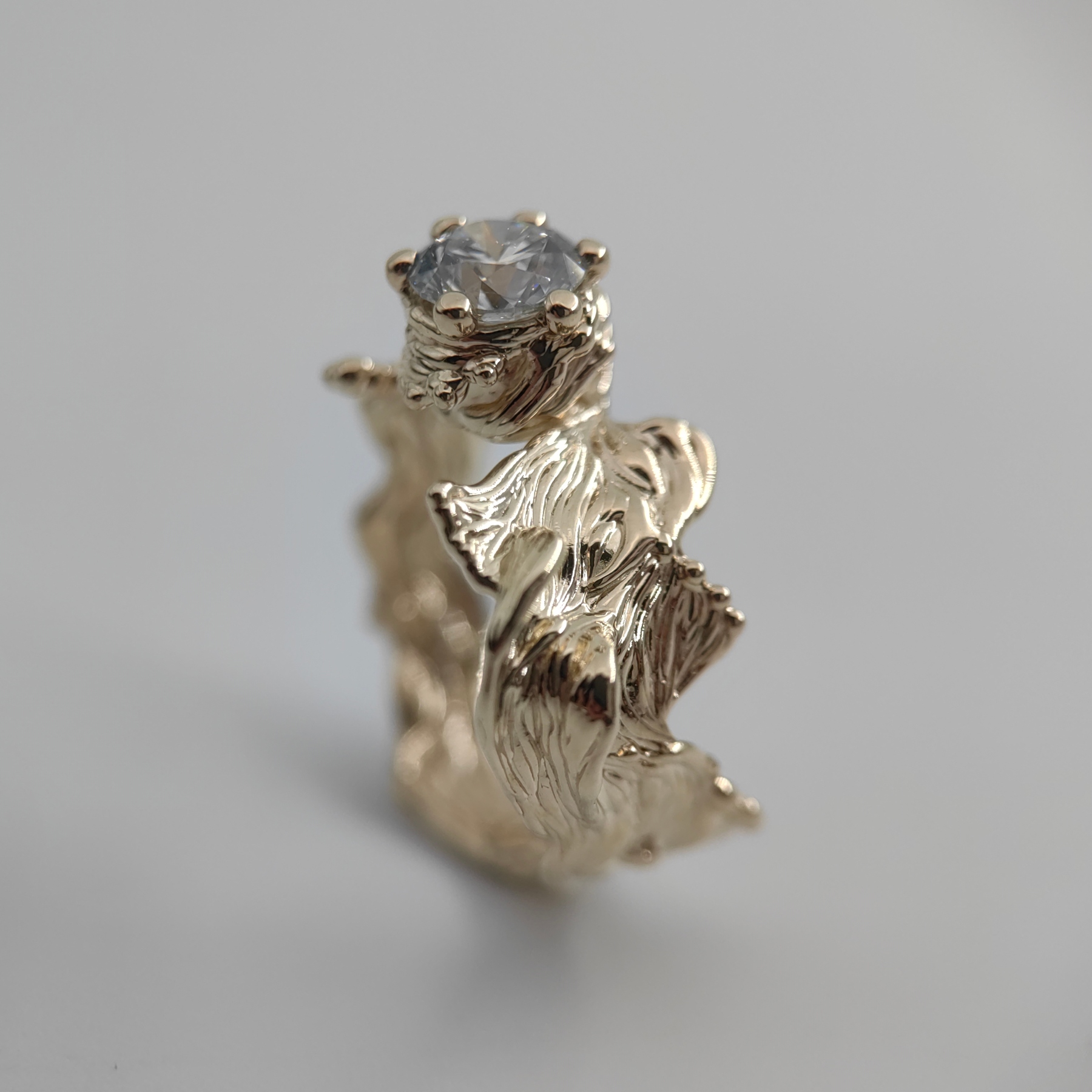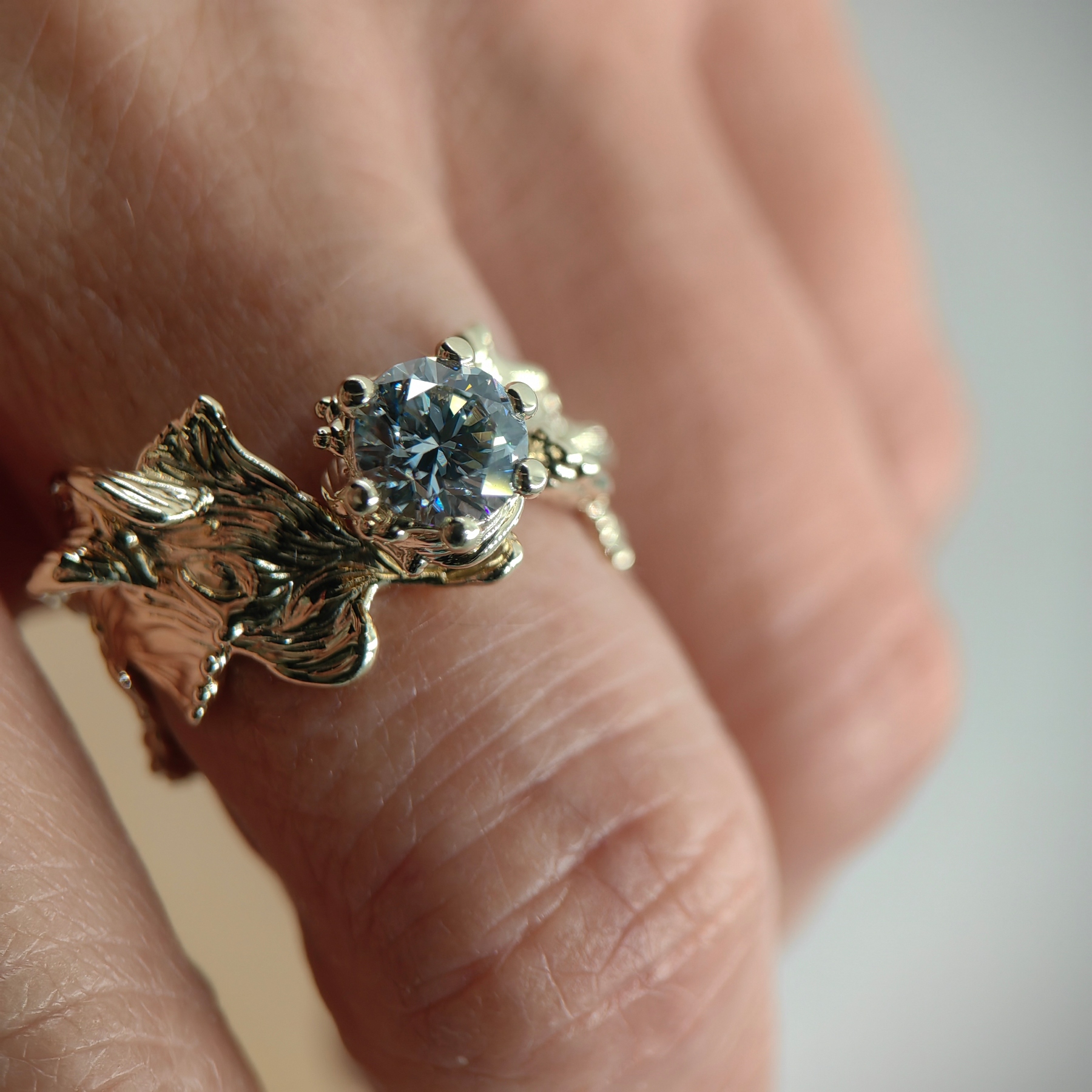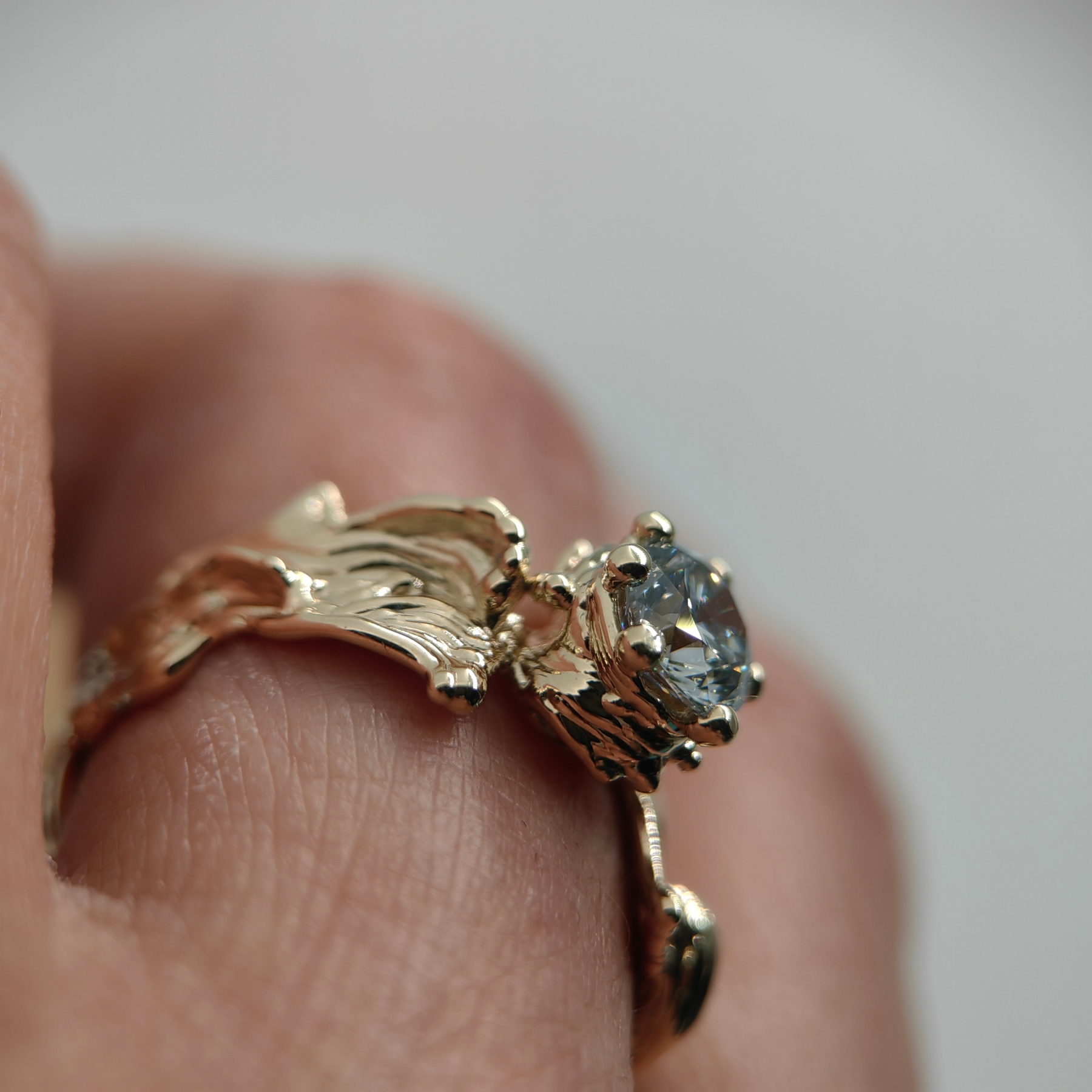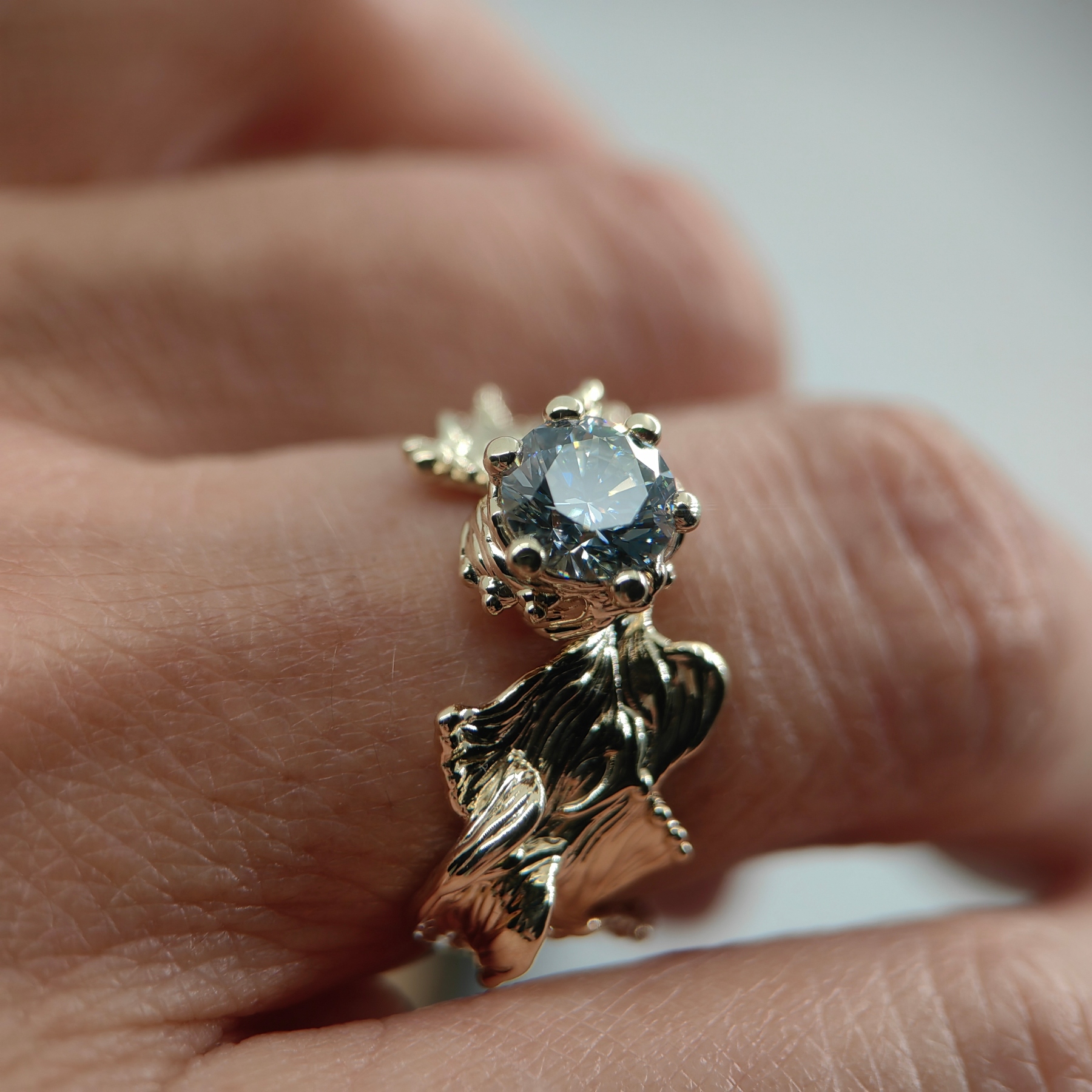 Pure, organically shaped 9K yellow gold frames a white 1.03 ct lab grown diamond of timeless brilliance. Its light is calm, precise, and enduring — a quiet expression of elegance and balance.