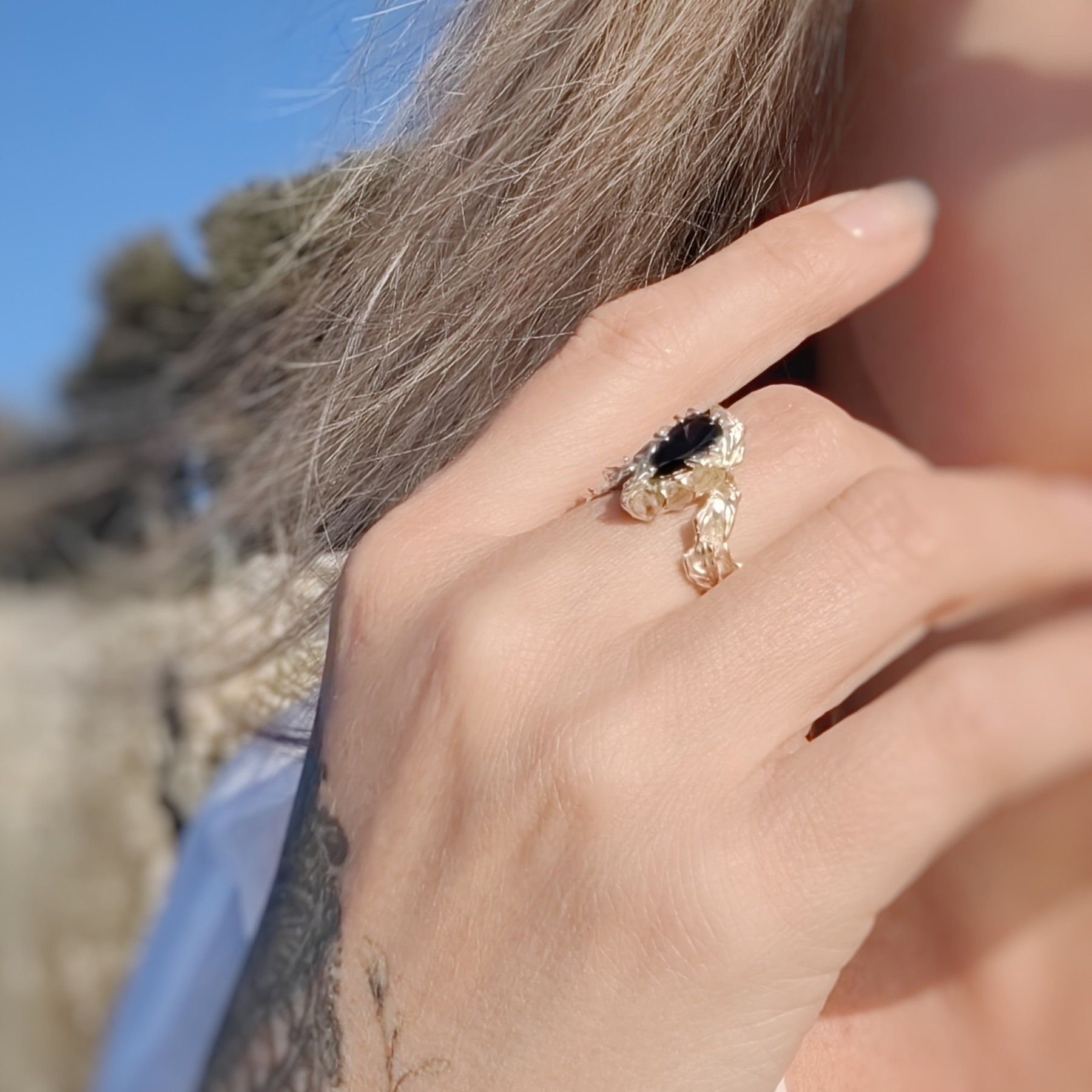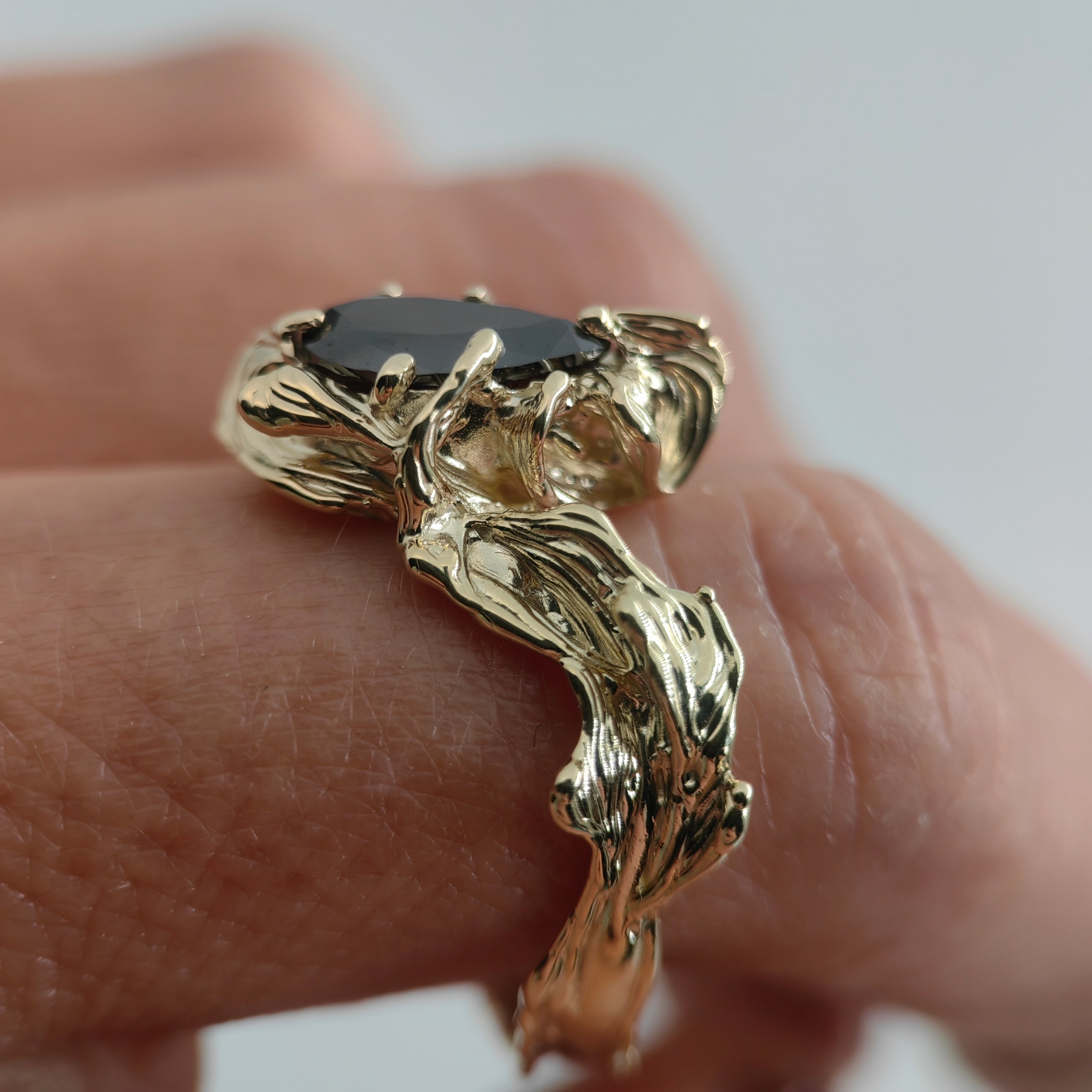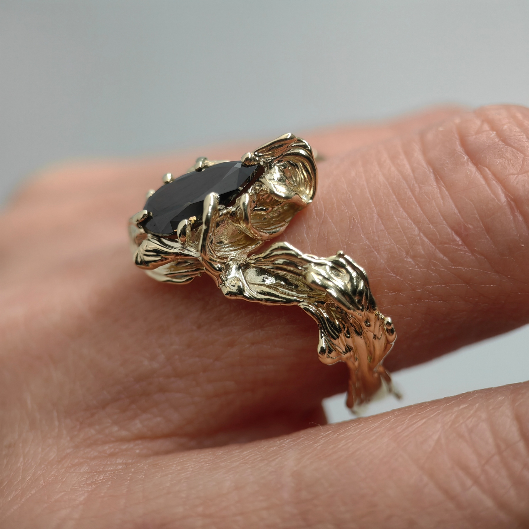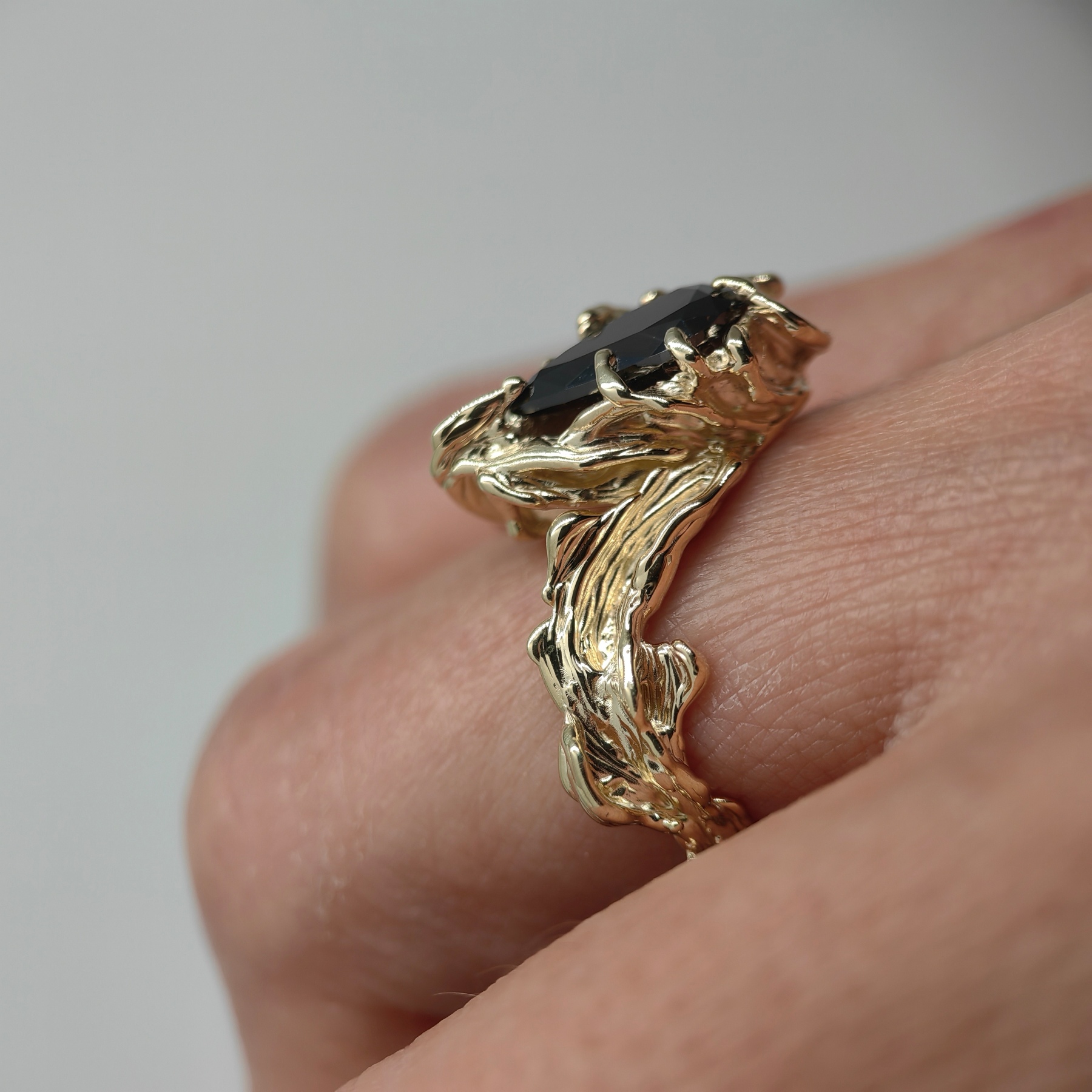 Flowing, organically shaped 9K yellow gold embraces a mysterious, dark, faceted lab grown black diamond that glows like a night-time ocean.