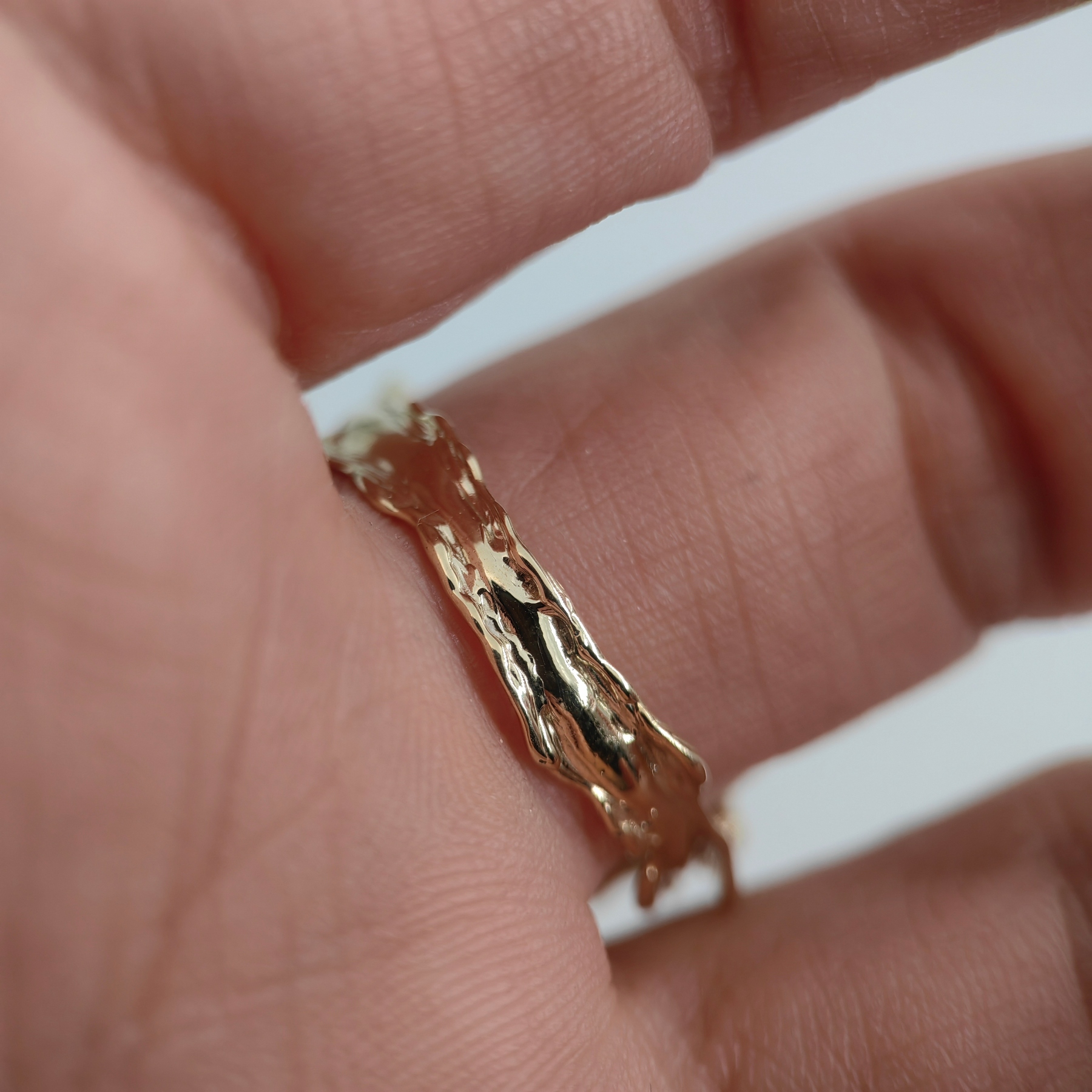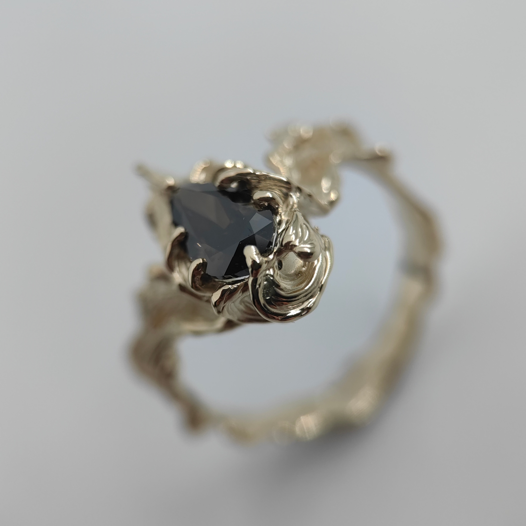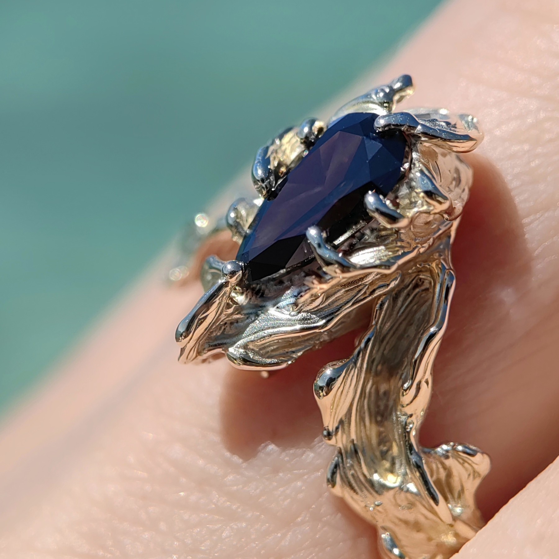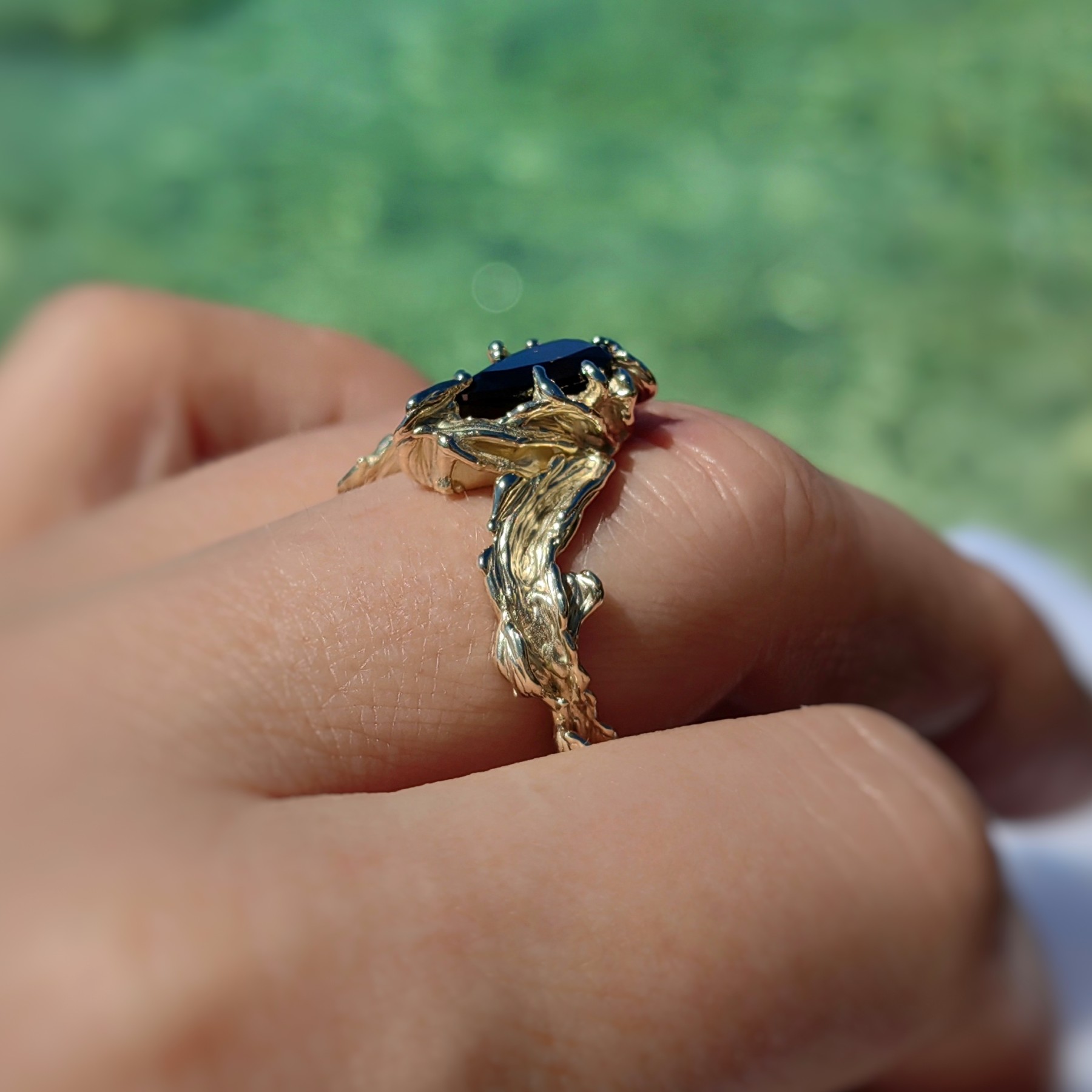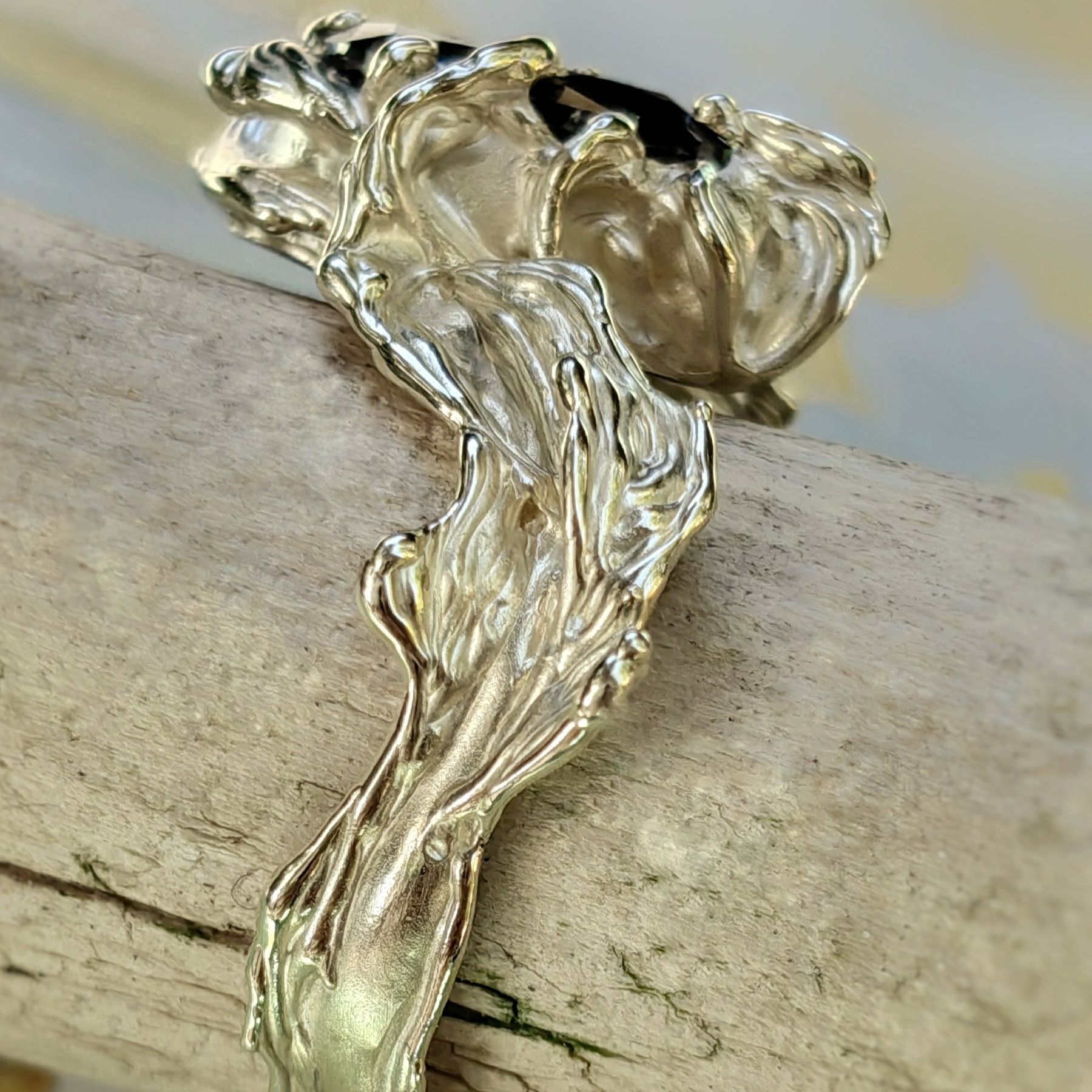 Flowing, organically shaped 9K yellow gold embraces a mysterious, dark, faceted lab grown black diamond that glows like a night-time ocean.