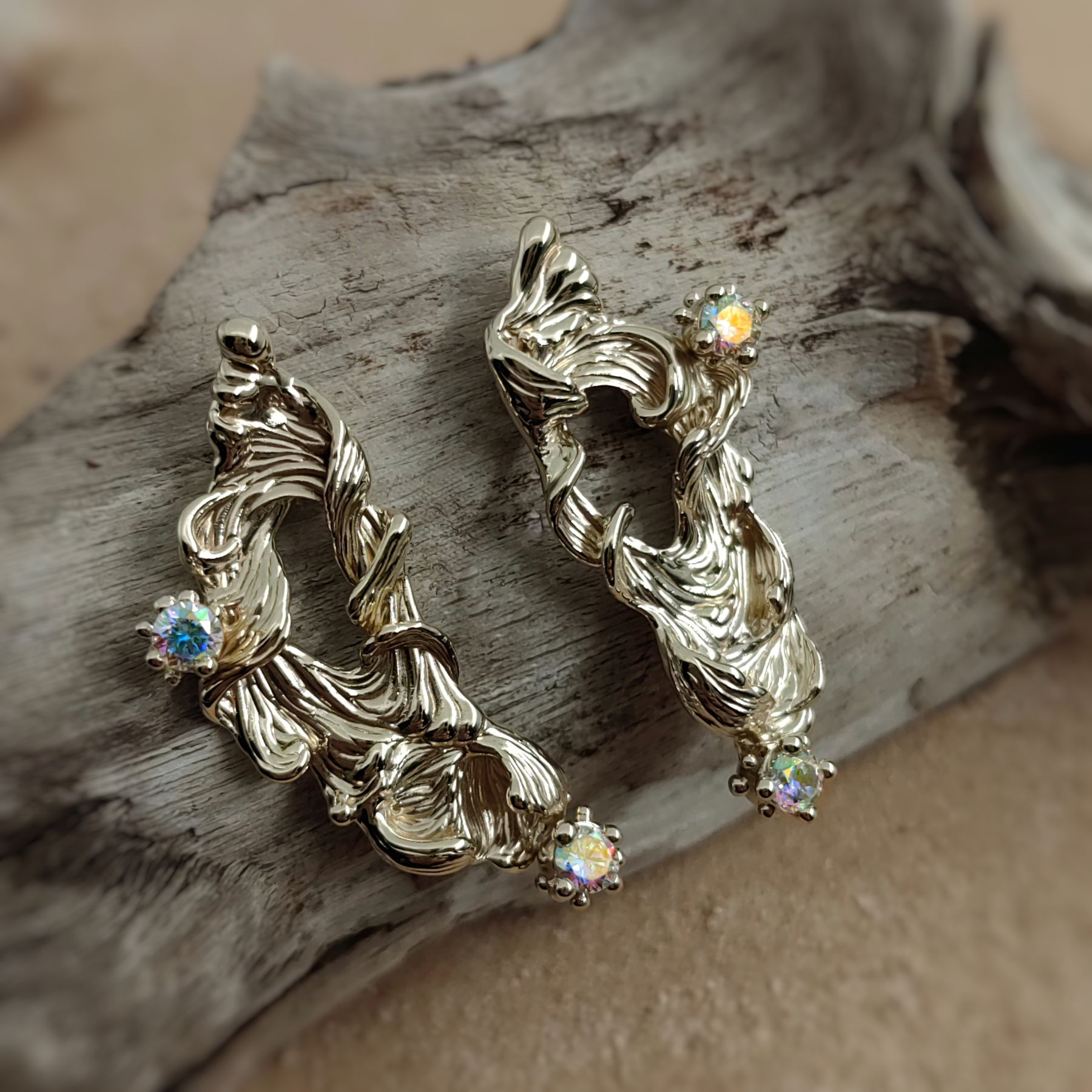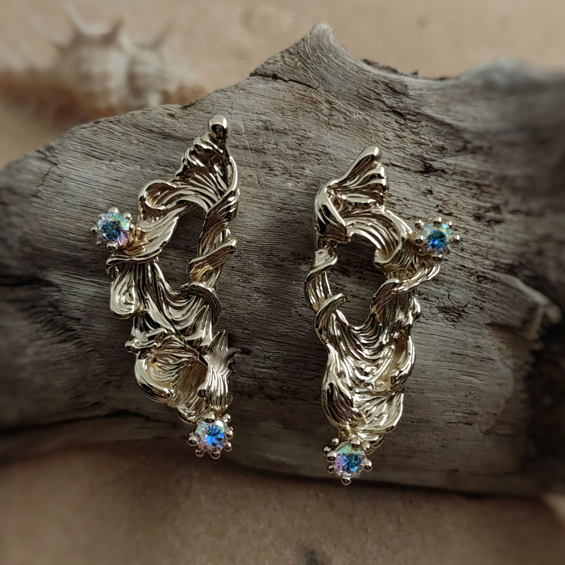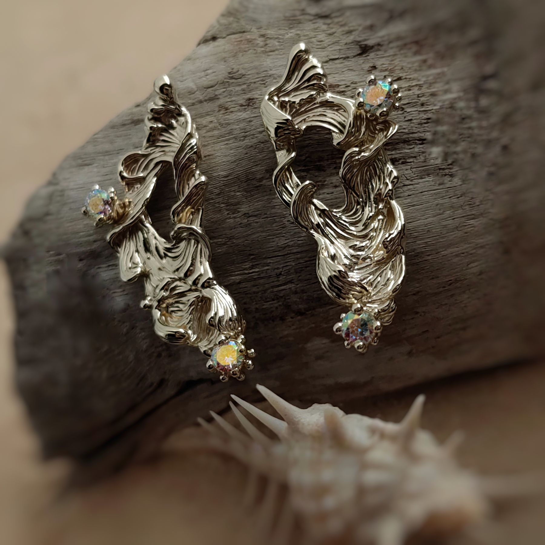 Statement earrings inspired by waves on the ocean's surface and mermaids — crafted in 9K yellow gold, set with a beautiful sparkling nanogem.
