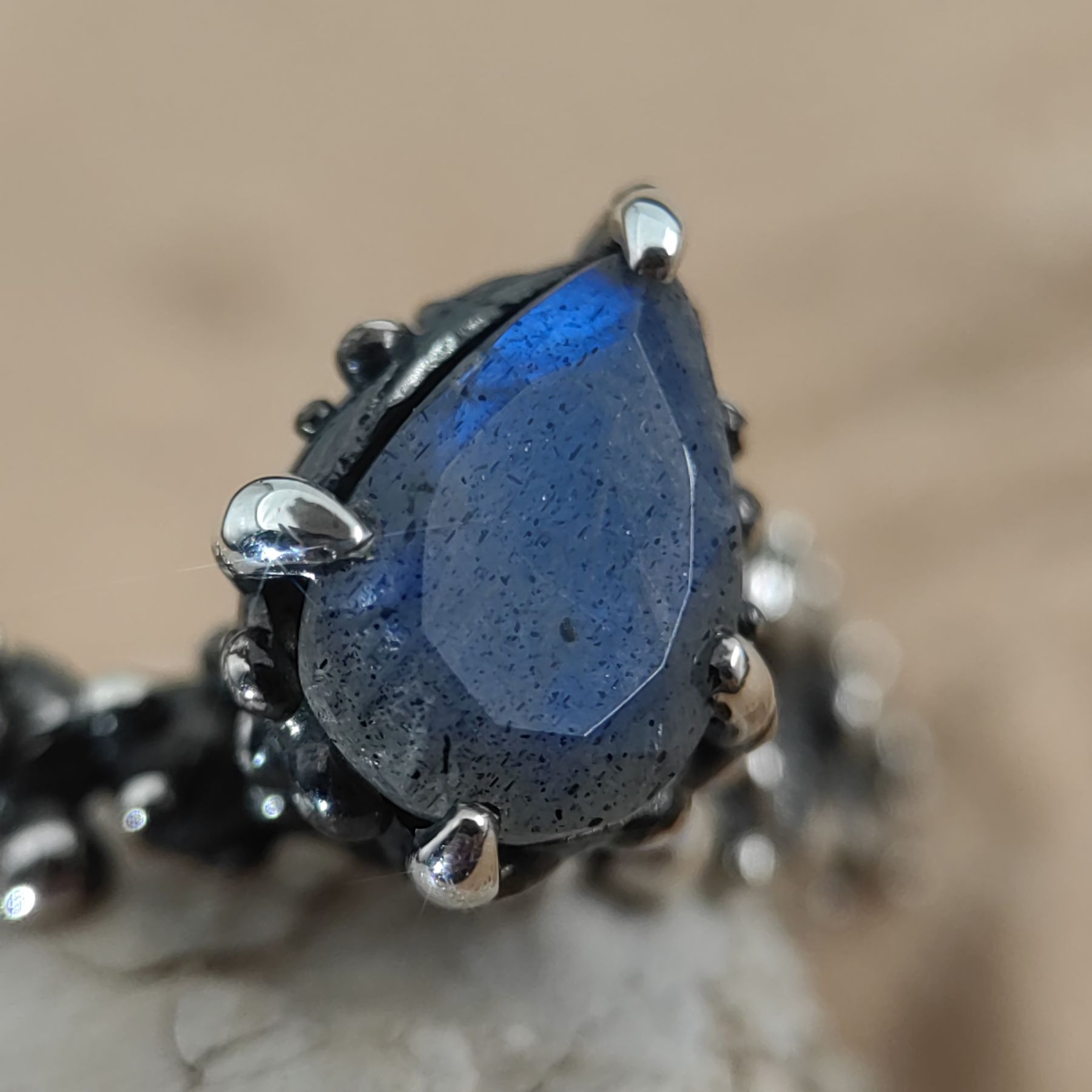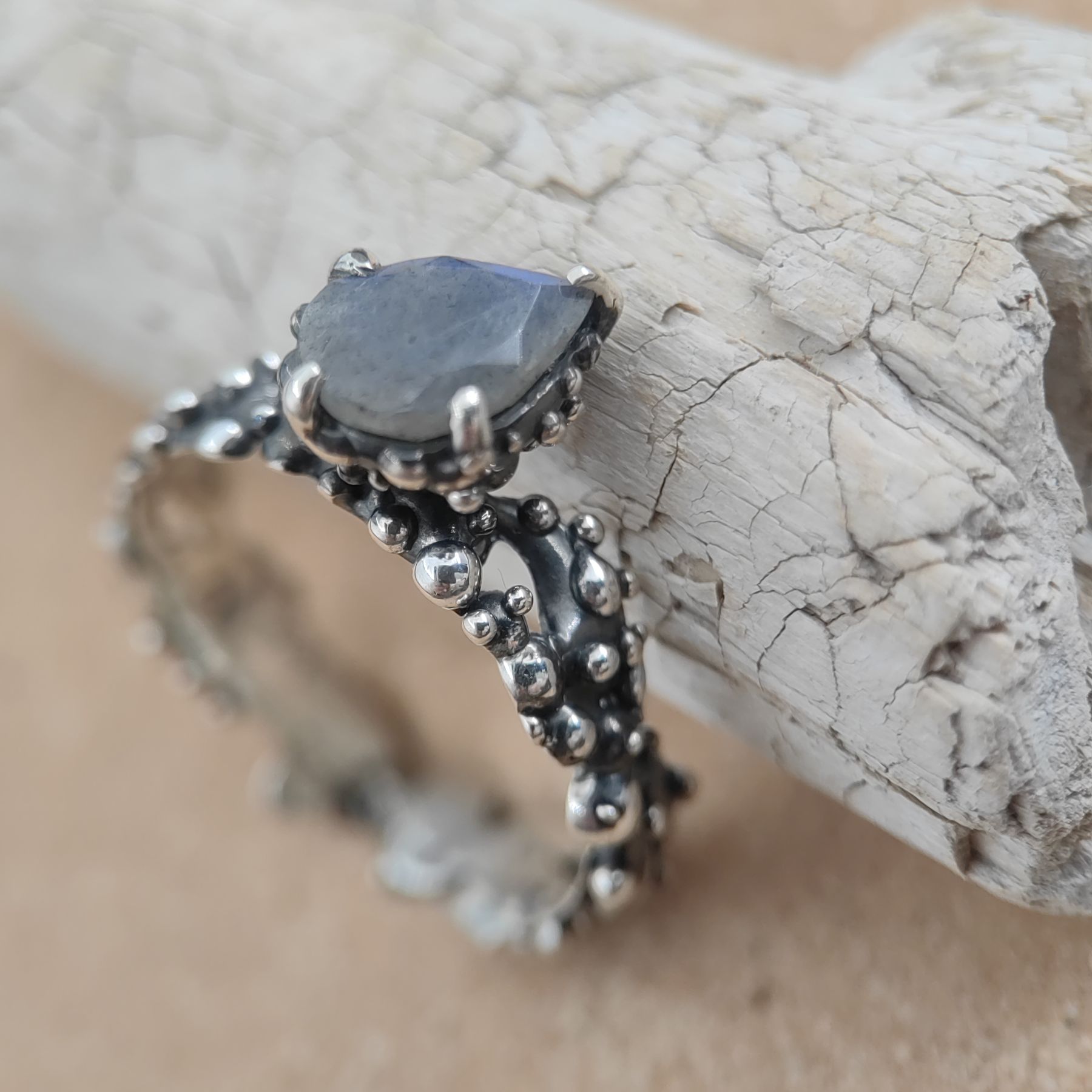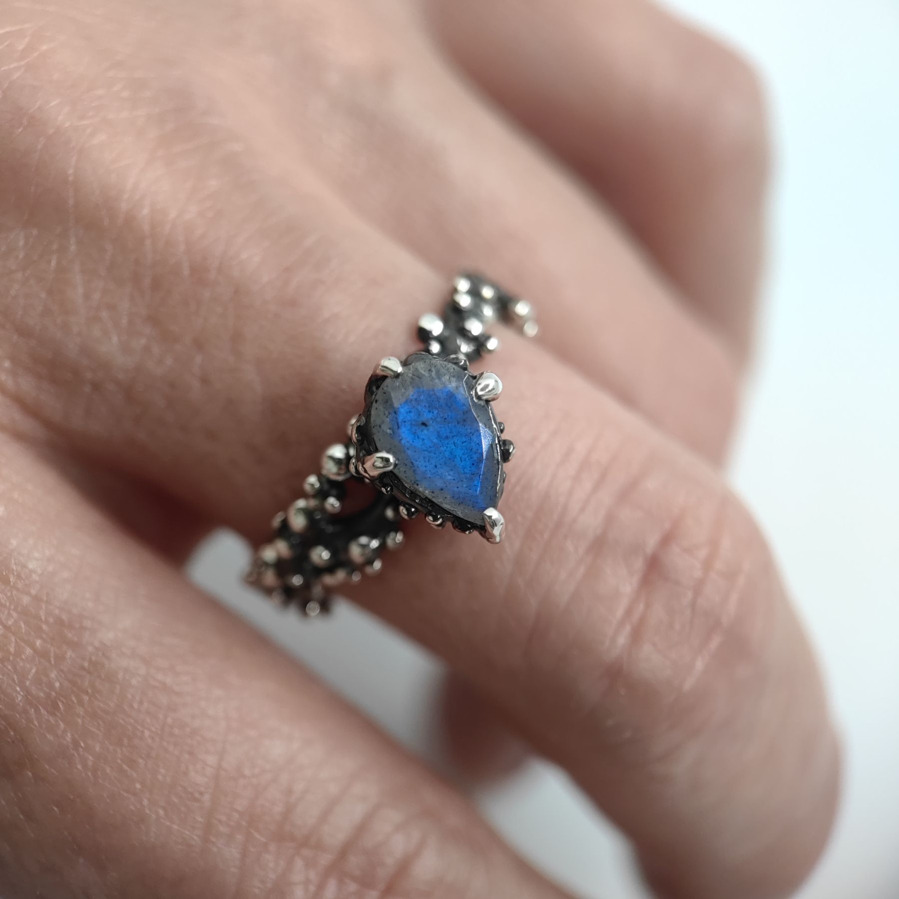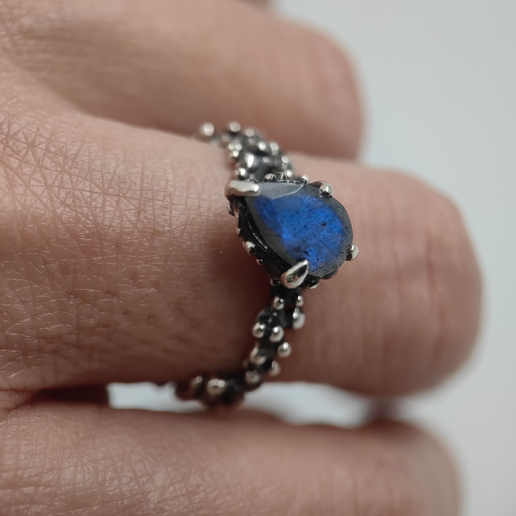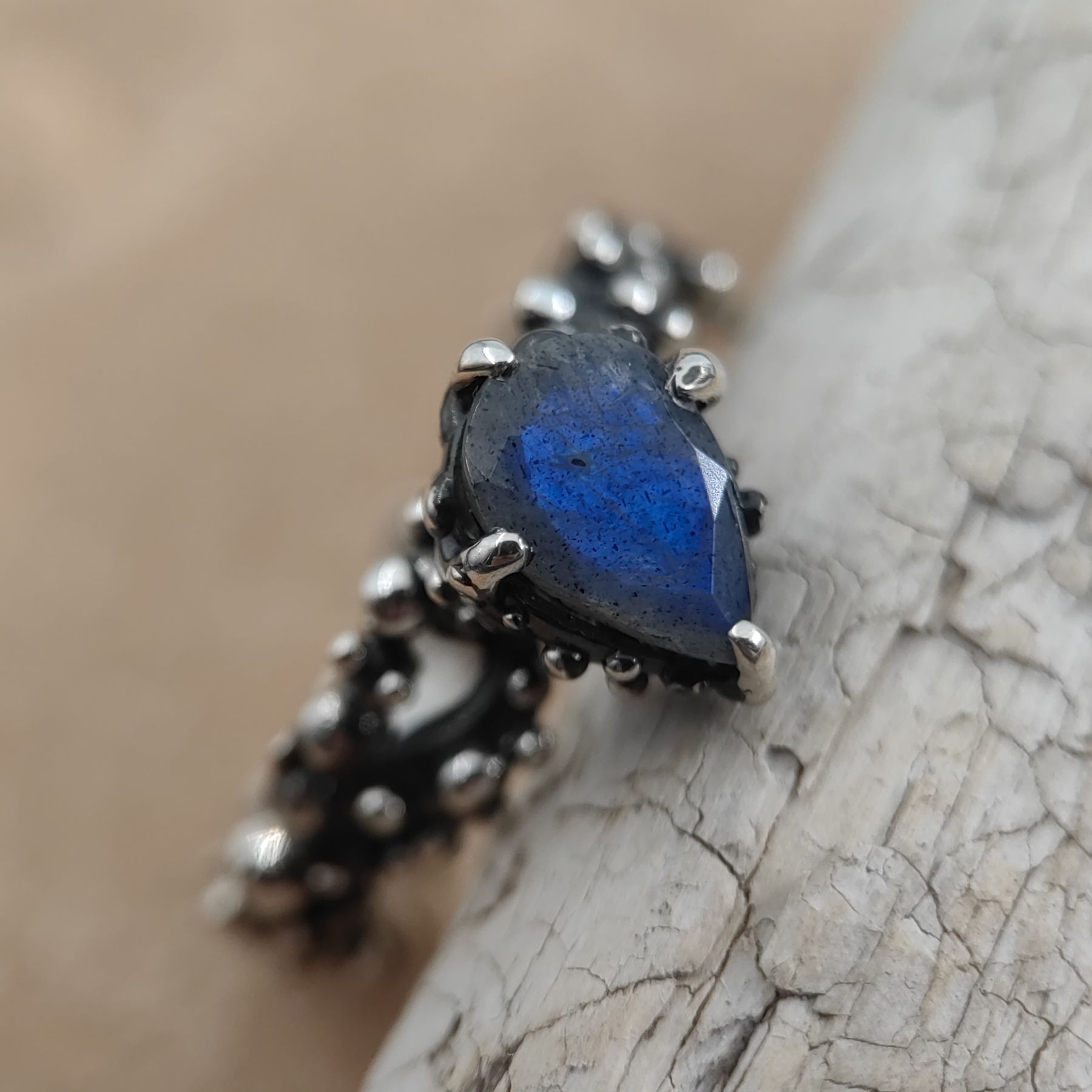 This handcrafted ring is made from 925 sterling silver and features a natural blue labradorite in a pear shape, evoking the deep blue sea.