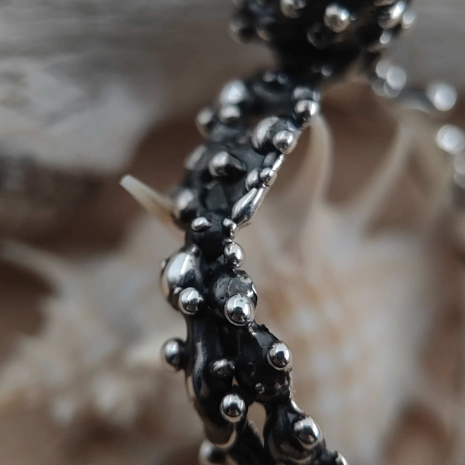 The silver surface is partially patinated to bring out texture and contrast.