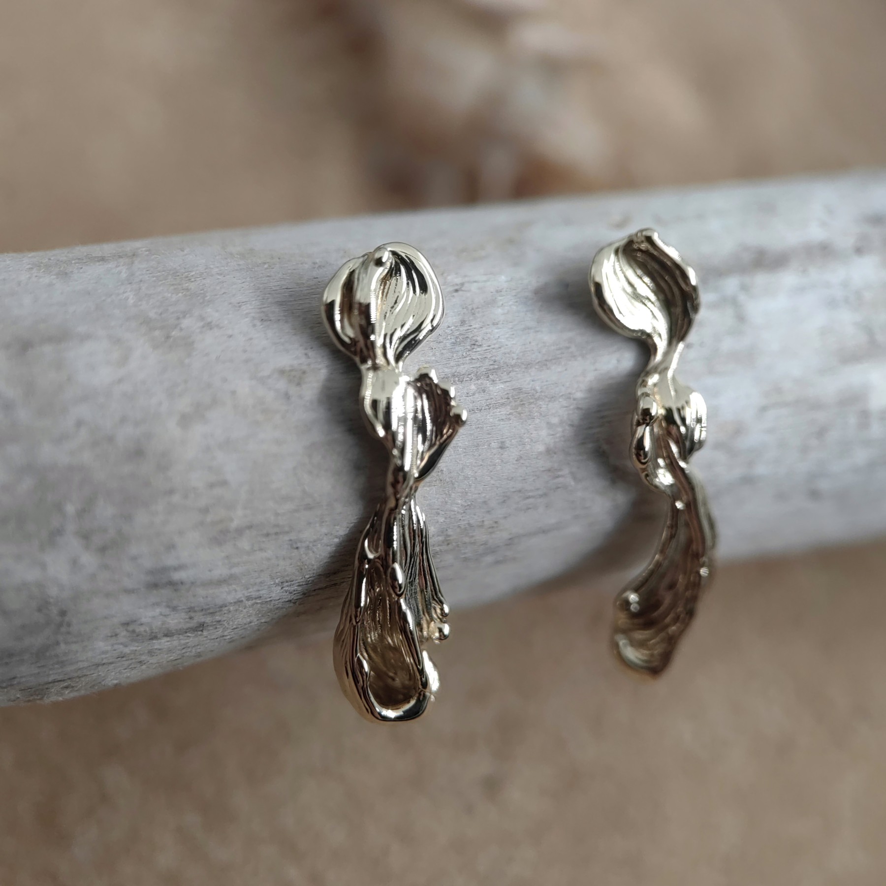 Long stud earrings shaped like play of waves on the ocean surface - in 9K gold.