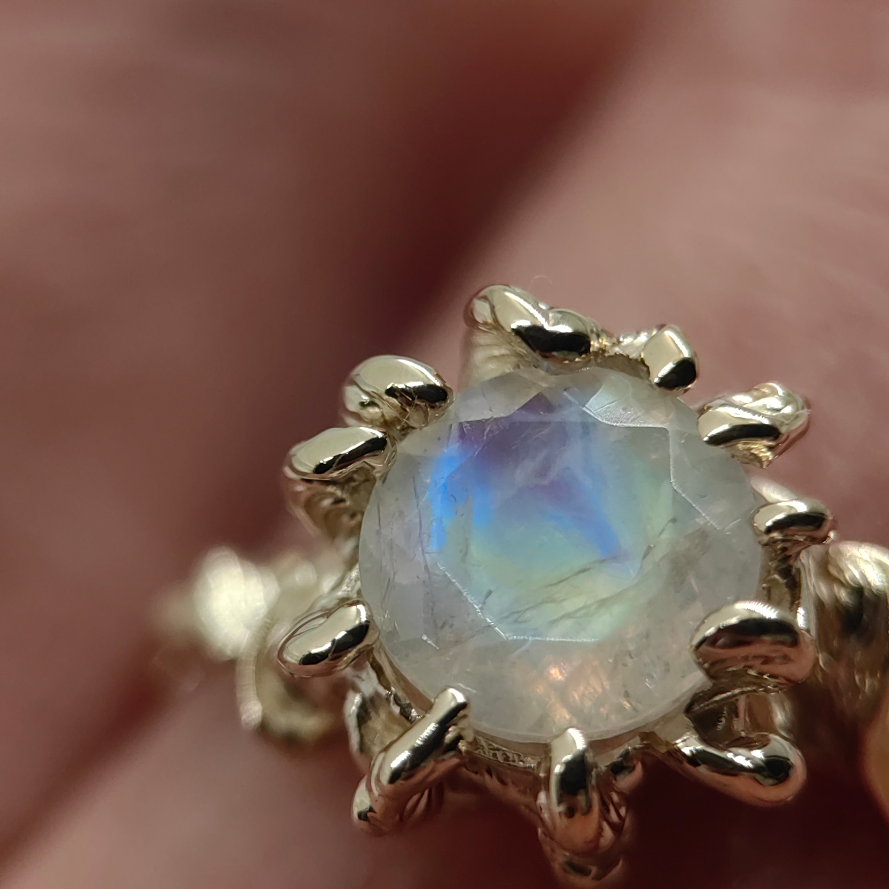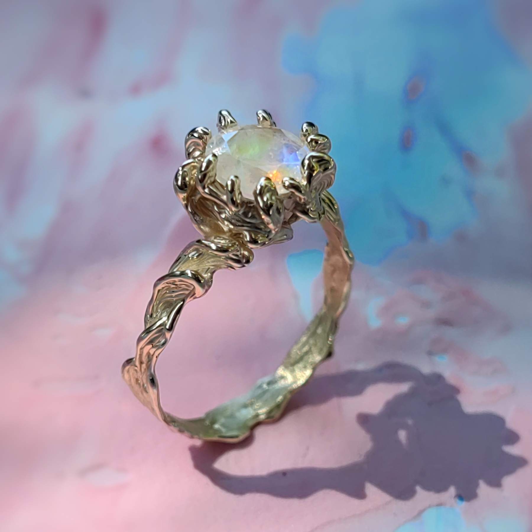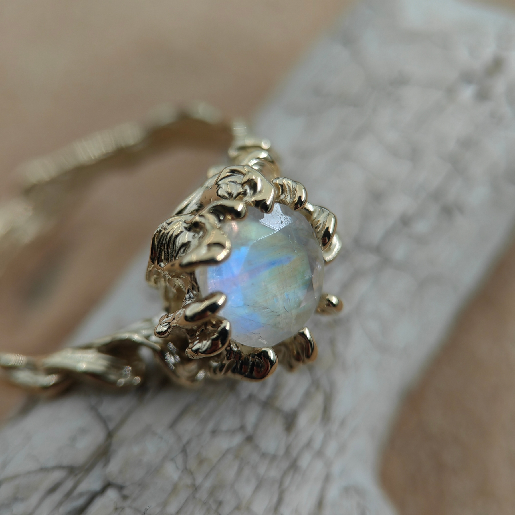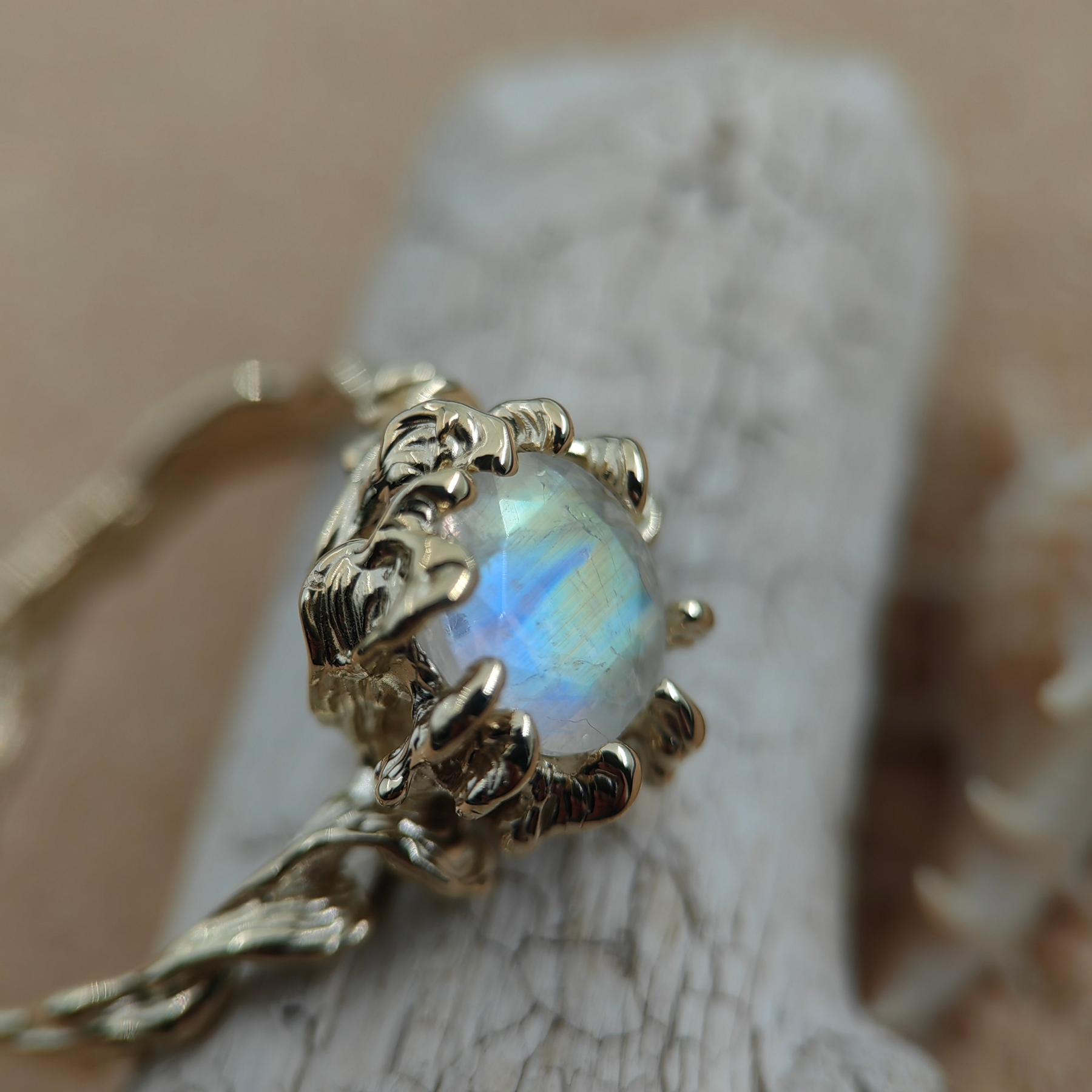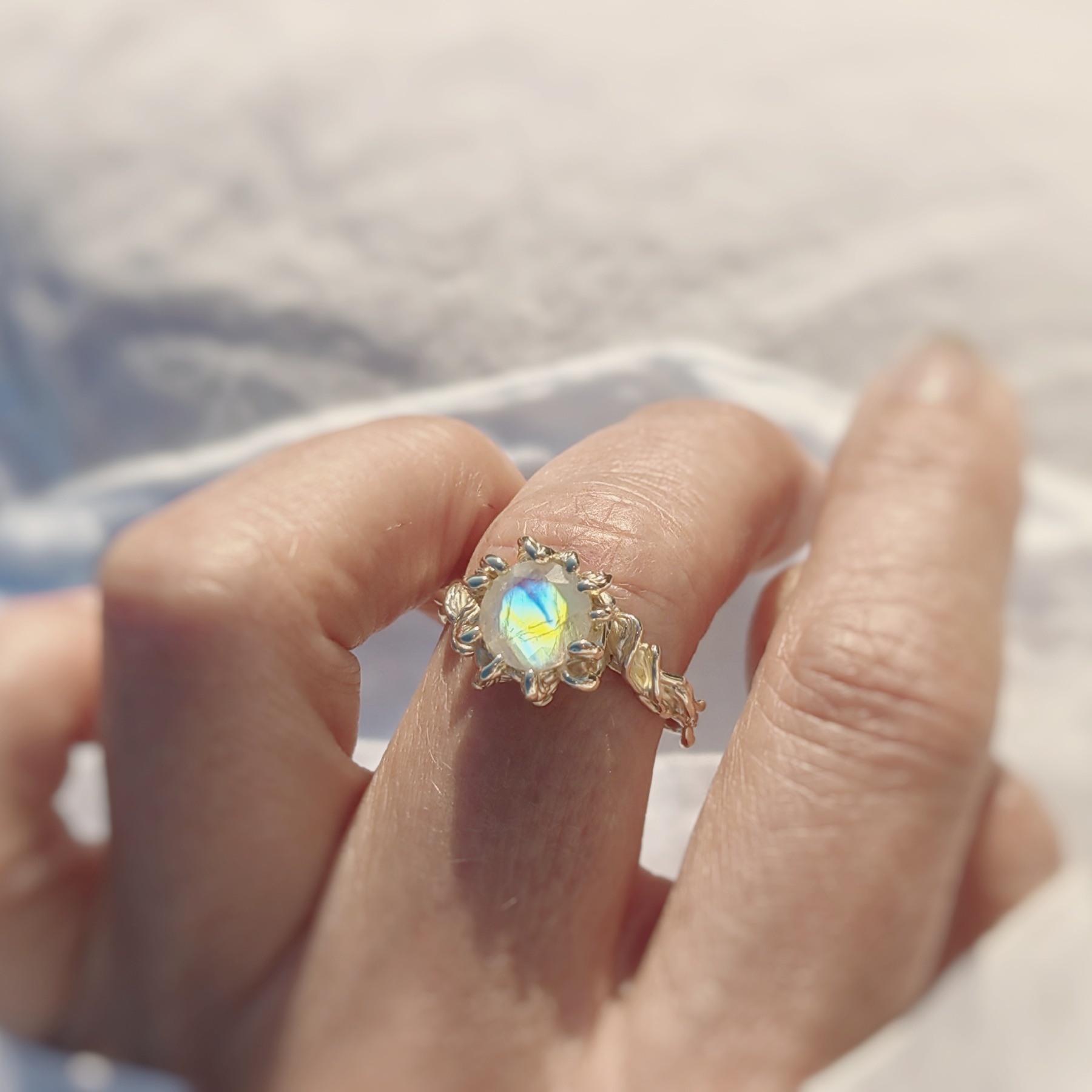 A delicate 8mm moonstone shimmers with ethereal colors, reflecting a rainbow of light like the glistening skin of a mermaid.