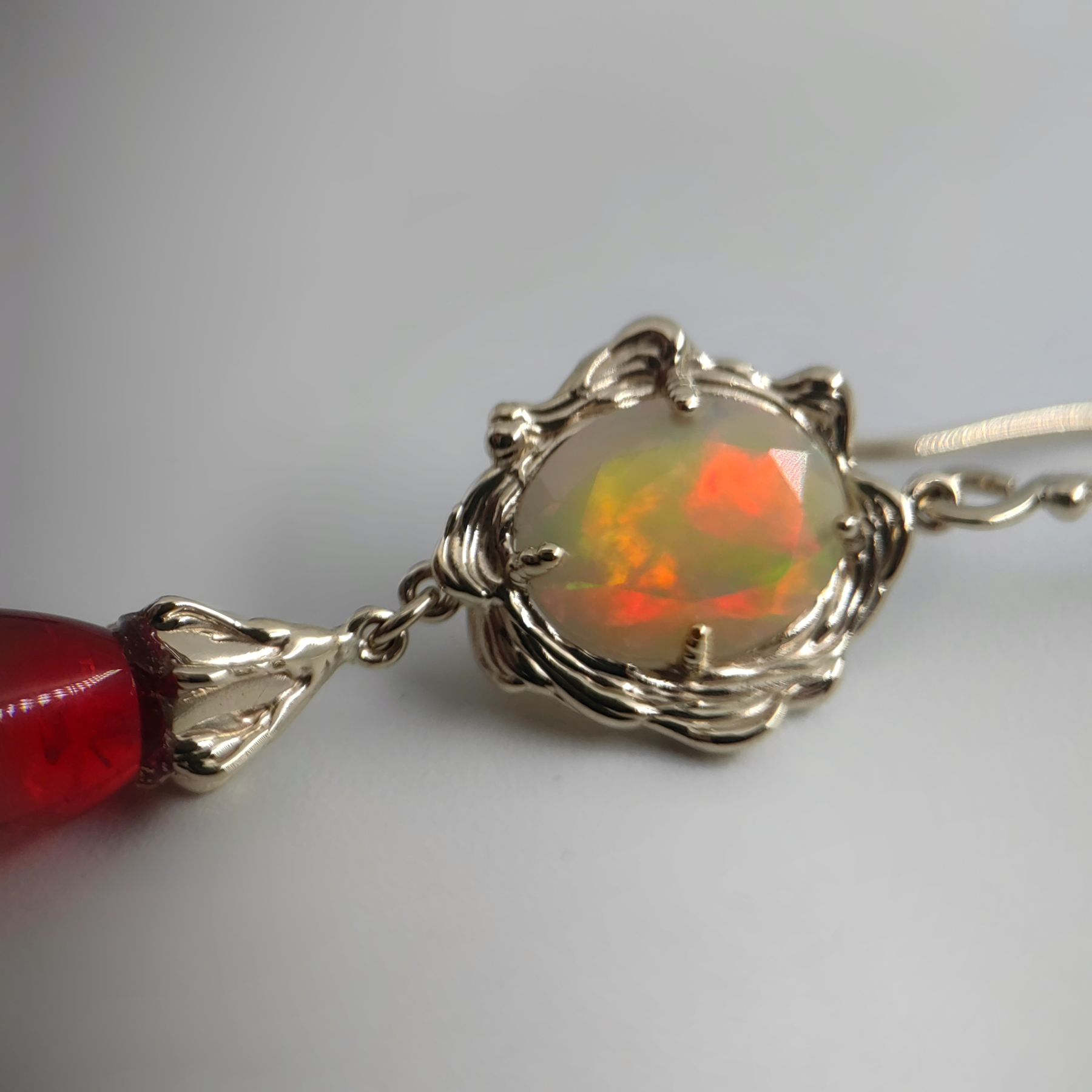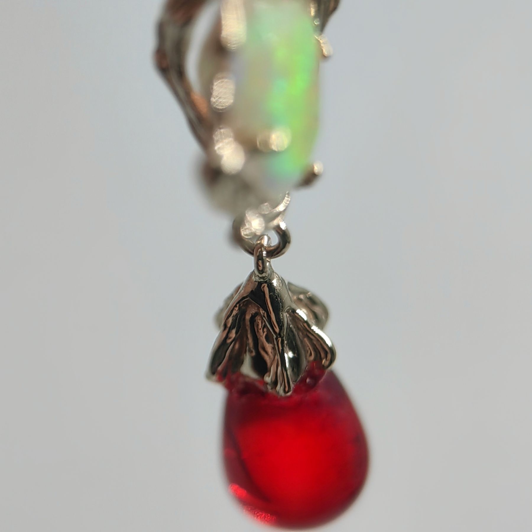 It is precisely in dialogue with Red Amber (10x6 mm) that the red spectrum awakens in opal, glowing with depth and warmth. Red amber, fossilized tree resin with coloration, brings warm radiance, lightness, and organic softness to the composition.