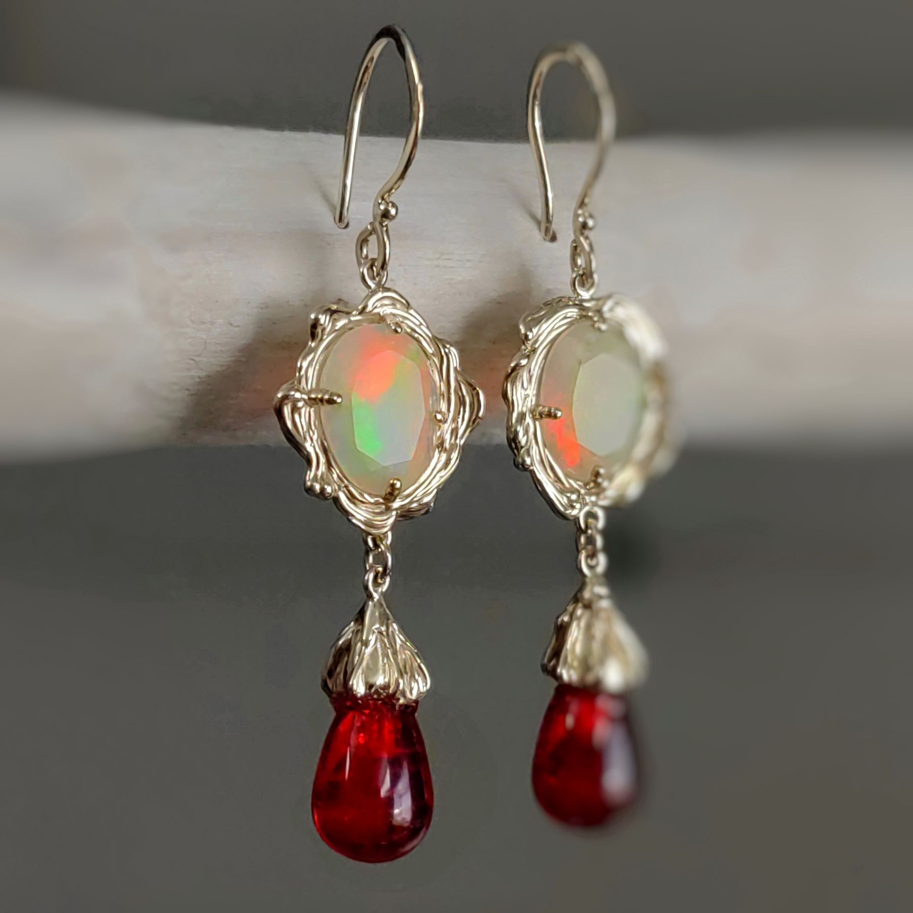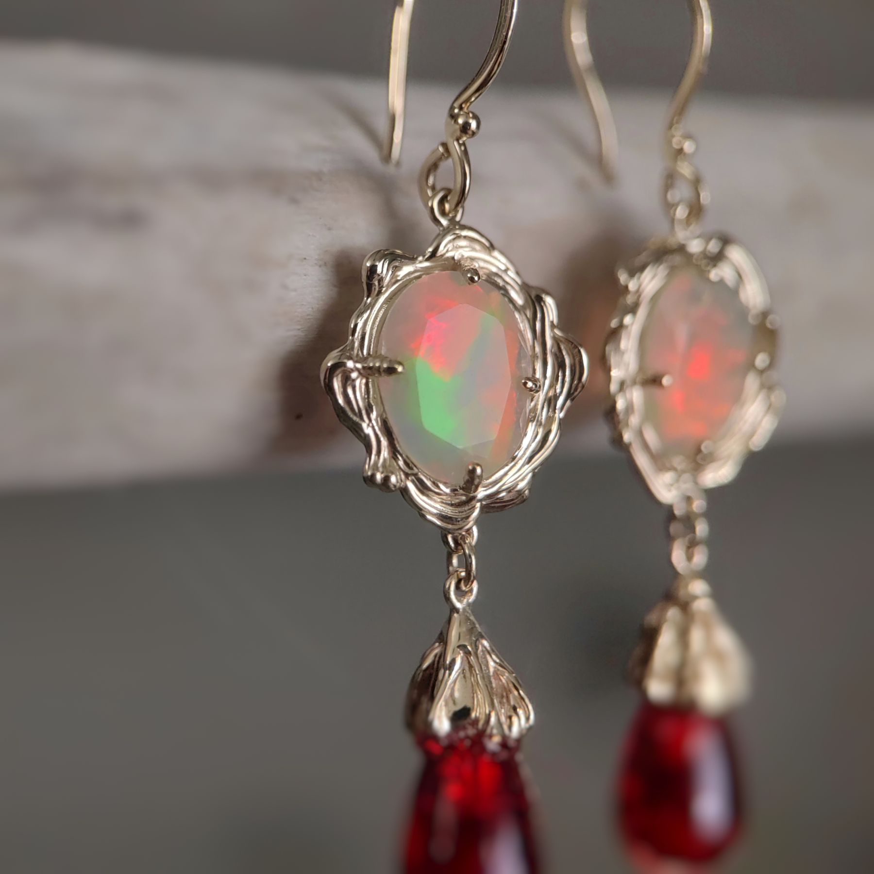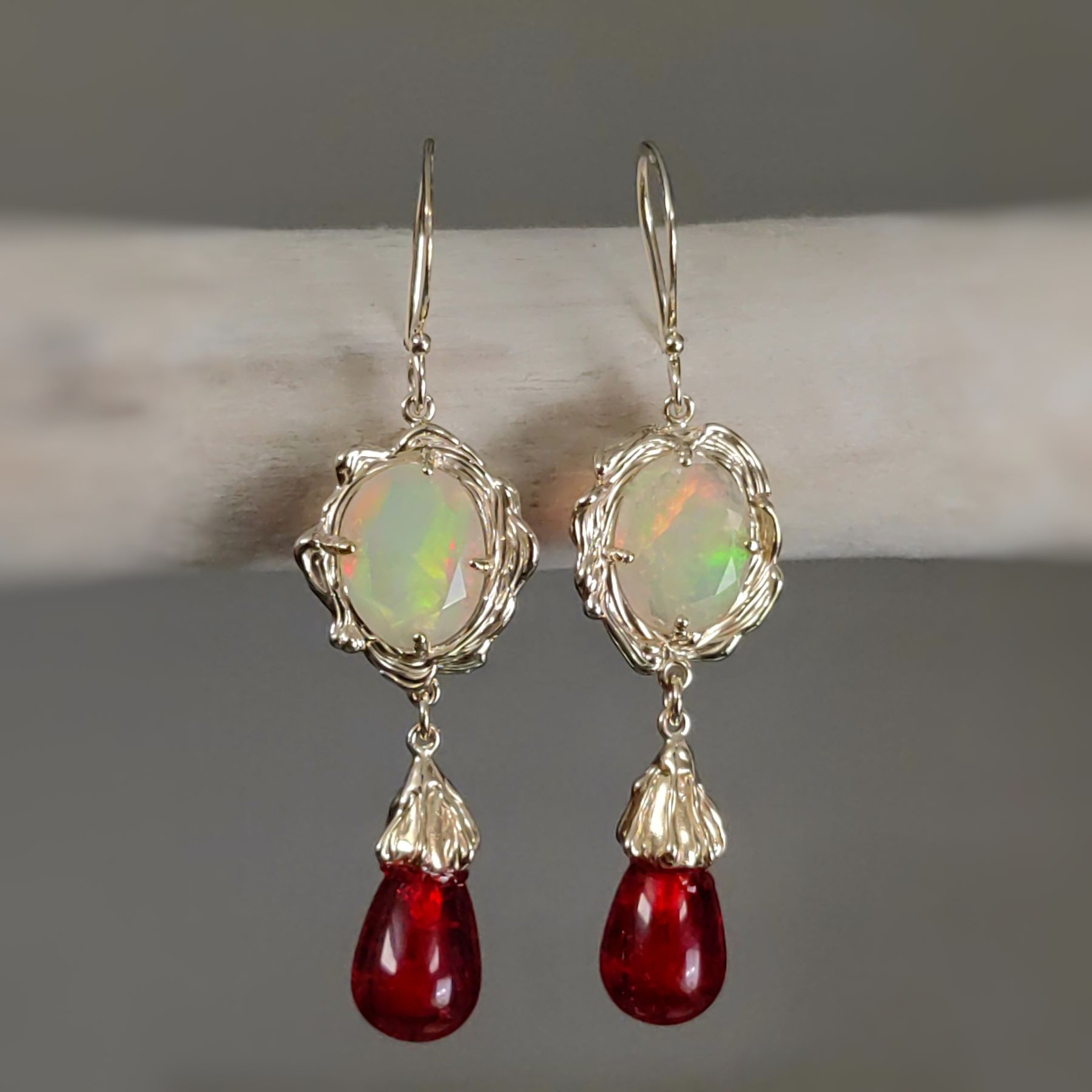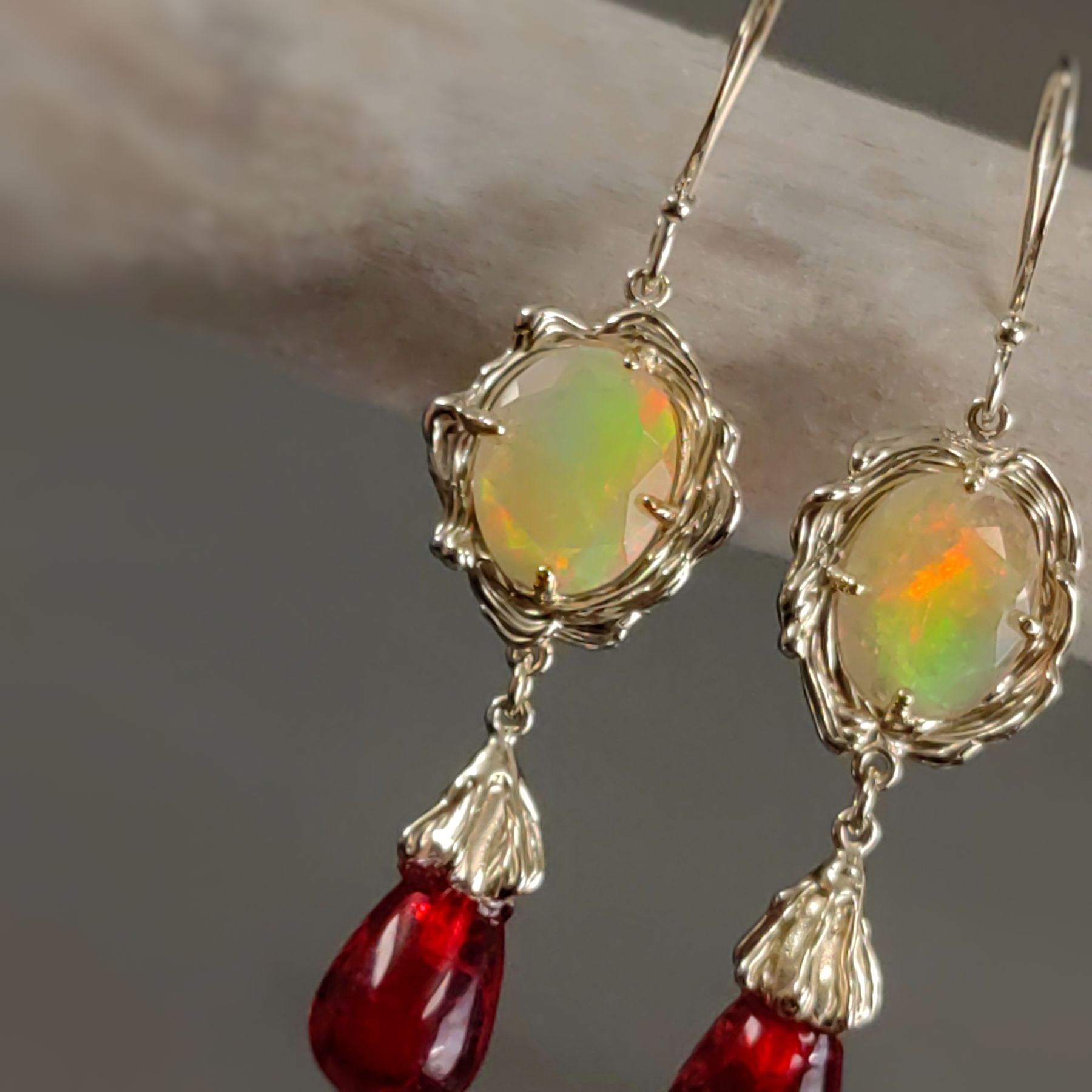 Wave Opal and Red Amber Gold Earrings • Unique 1/1