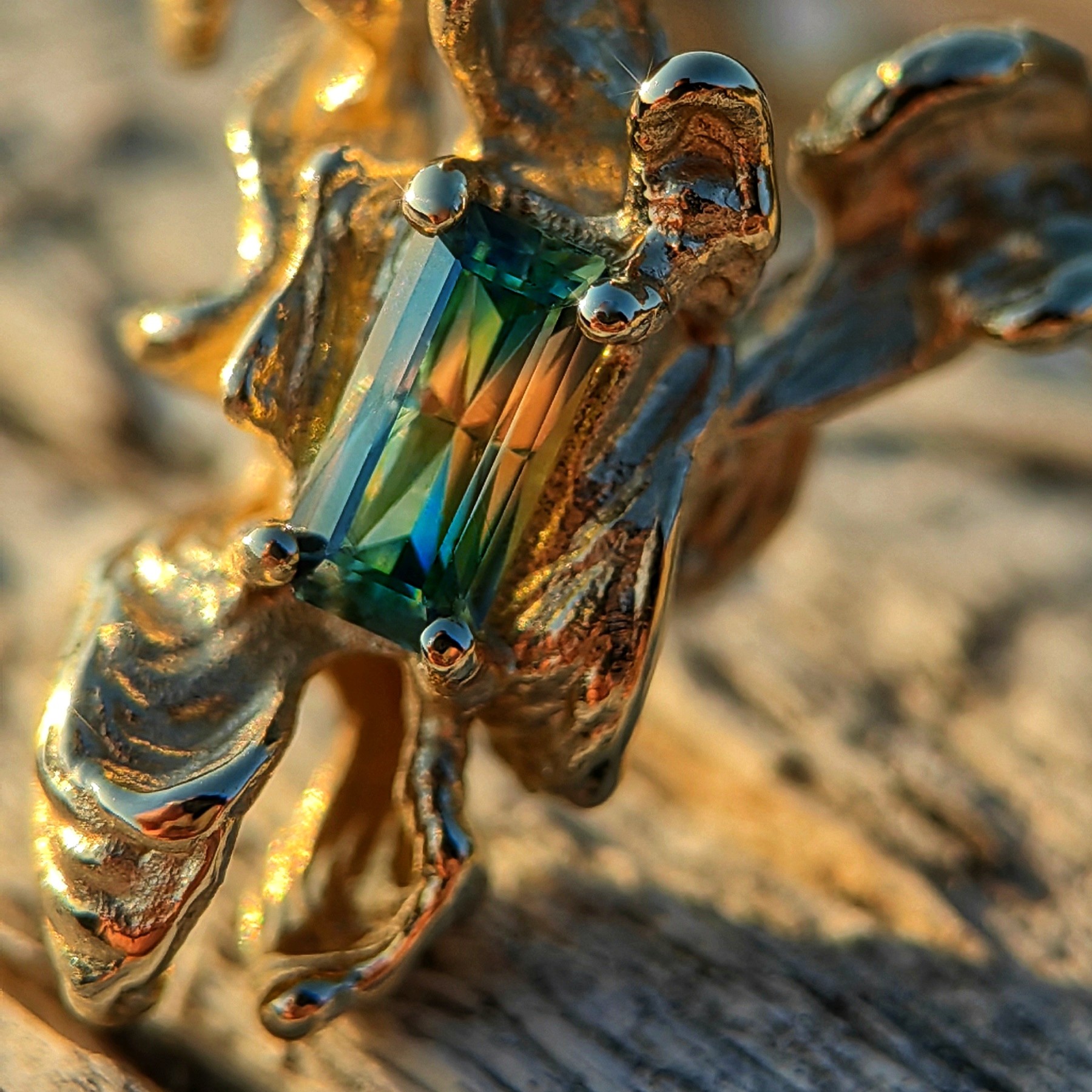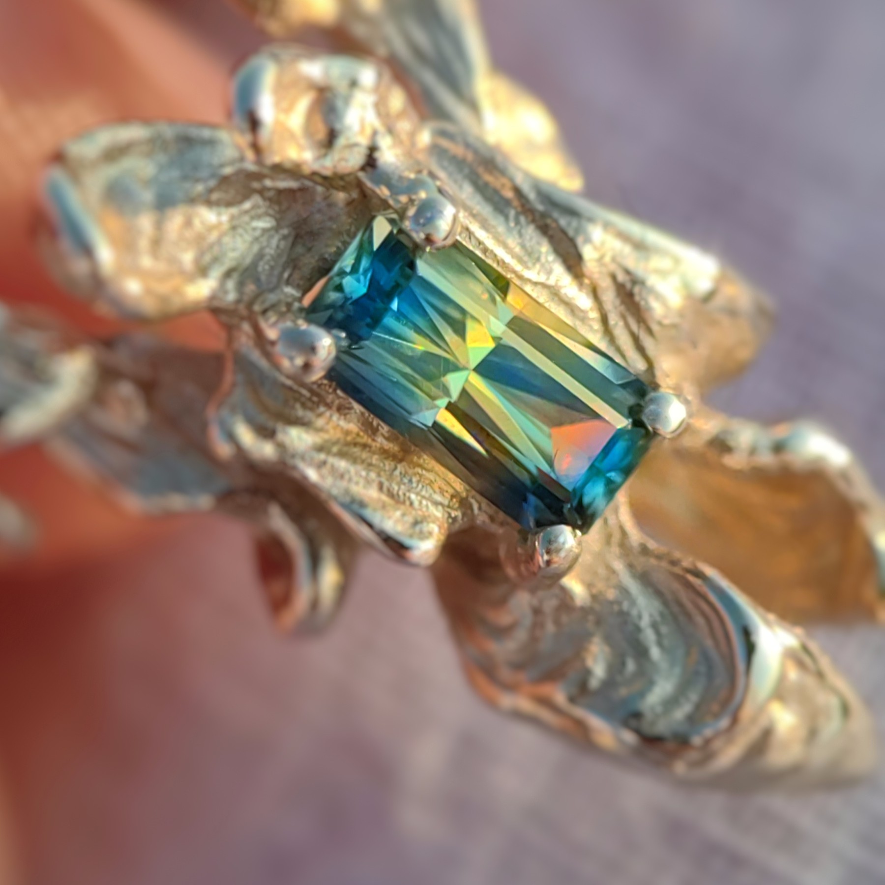 This ring features a stunning Australian Party Sapphire, meticulously hand-cut by a skilled Slovene gem cutter.