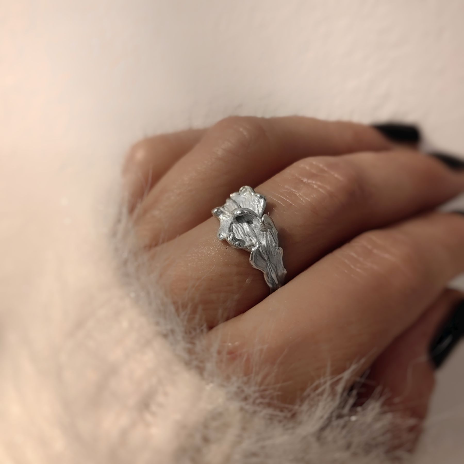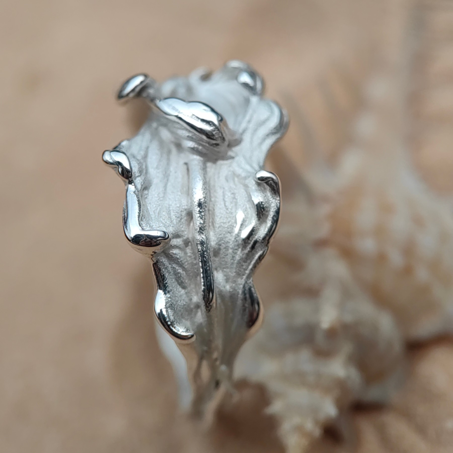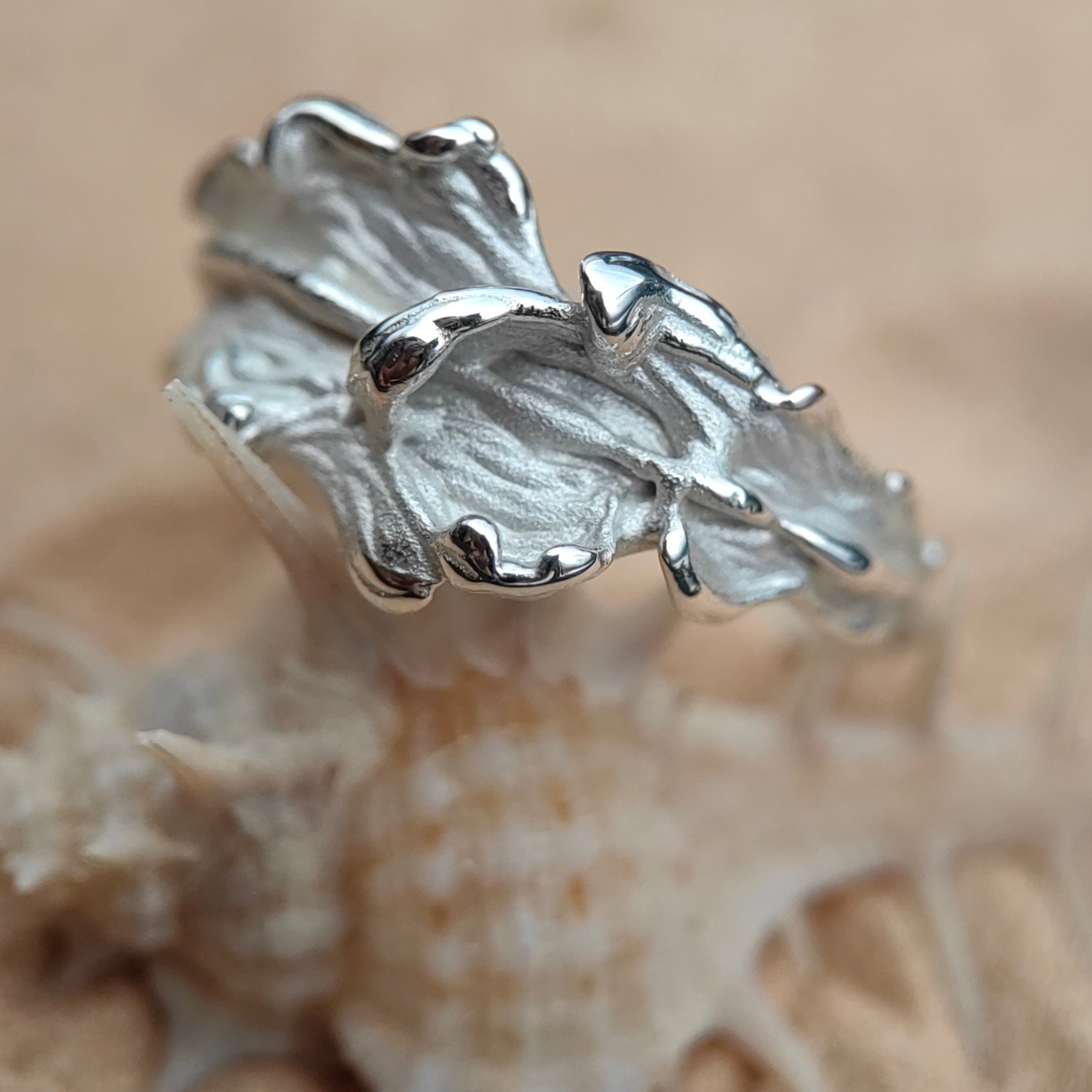 Handcrafted ring made of 925 sterling silver without a gemstone, shaped into an organic, sculptural form that evokes waves.